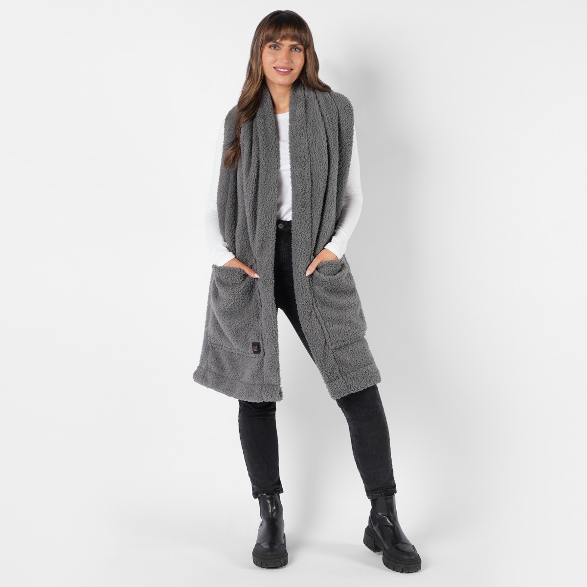 Stay warm in style with the OHS Heated Teddy Pocket Scarf in Charcoal. This cozy scarf not only wraps you in plush teddy fabric but also features built-in heating technology. The discreet pockets house rechargeable batteries, providing warmth on chilly days. Embrace comfort and fashion with this must-have winter accessory.