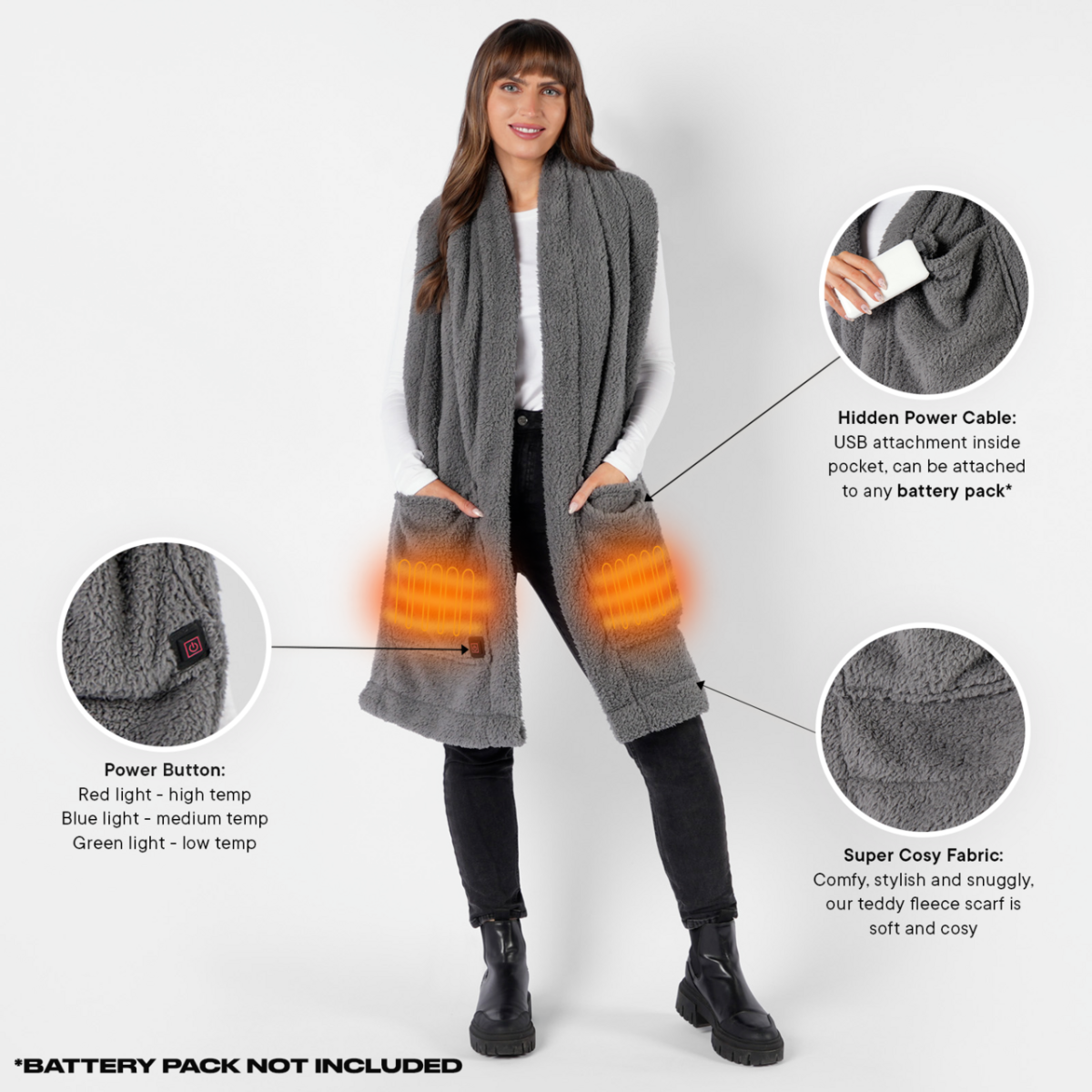 Includes: 1 x scarf with pockets (Power Bank not included*).