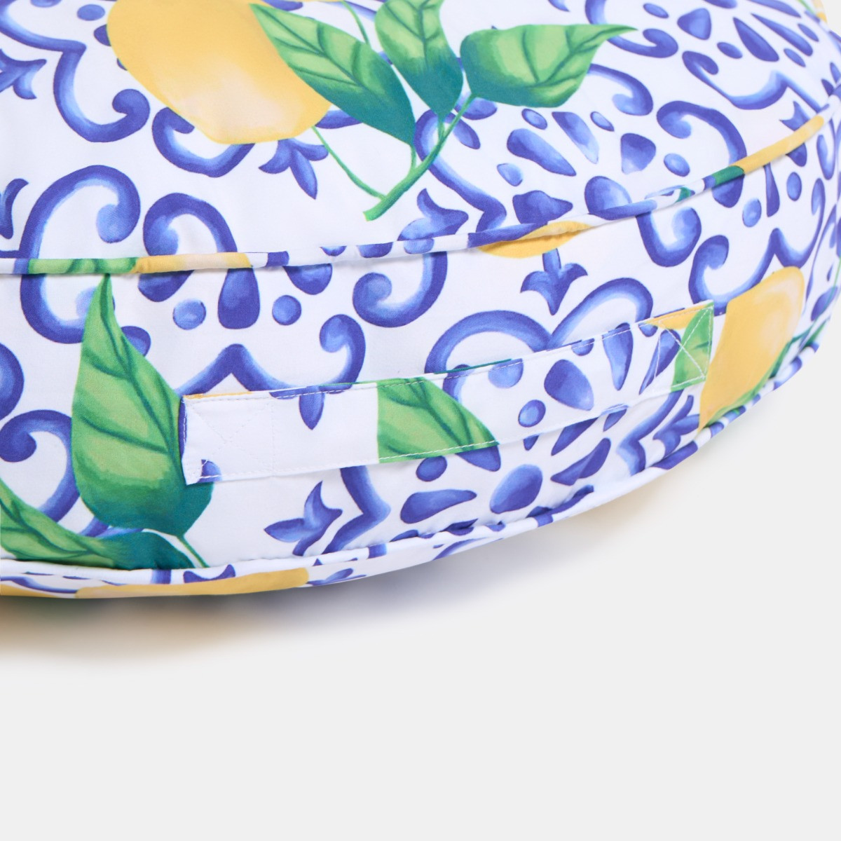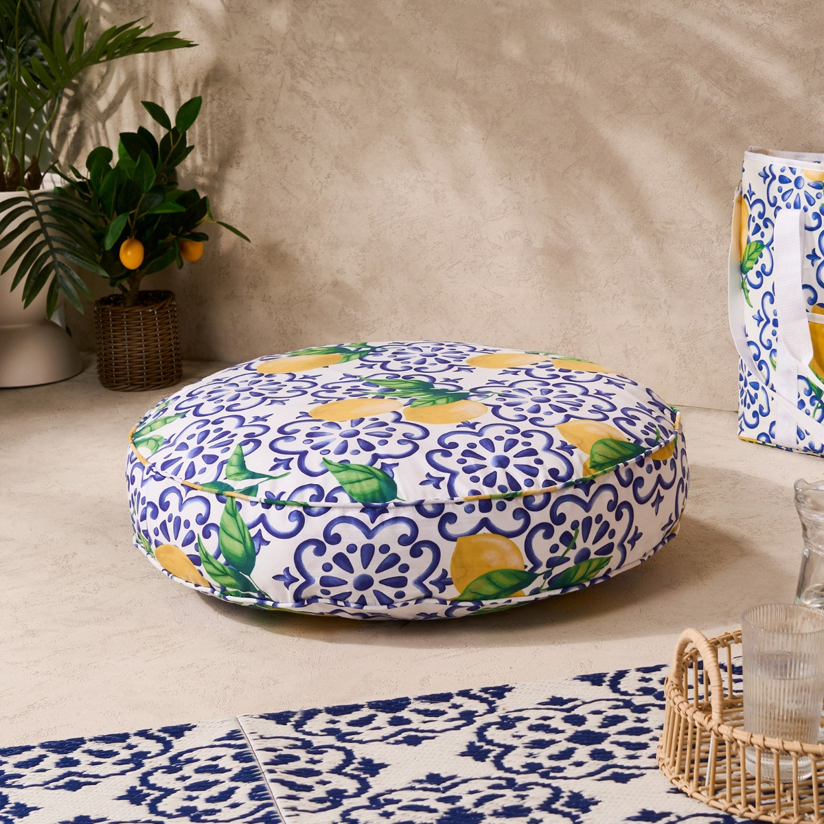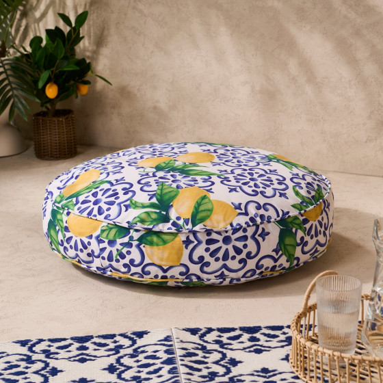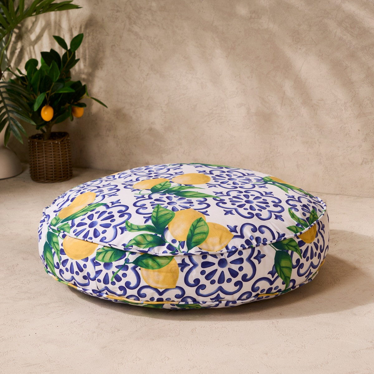 OHS Indoor/Outdoor Round Lemon Print Filled Cushion - White/Blue