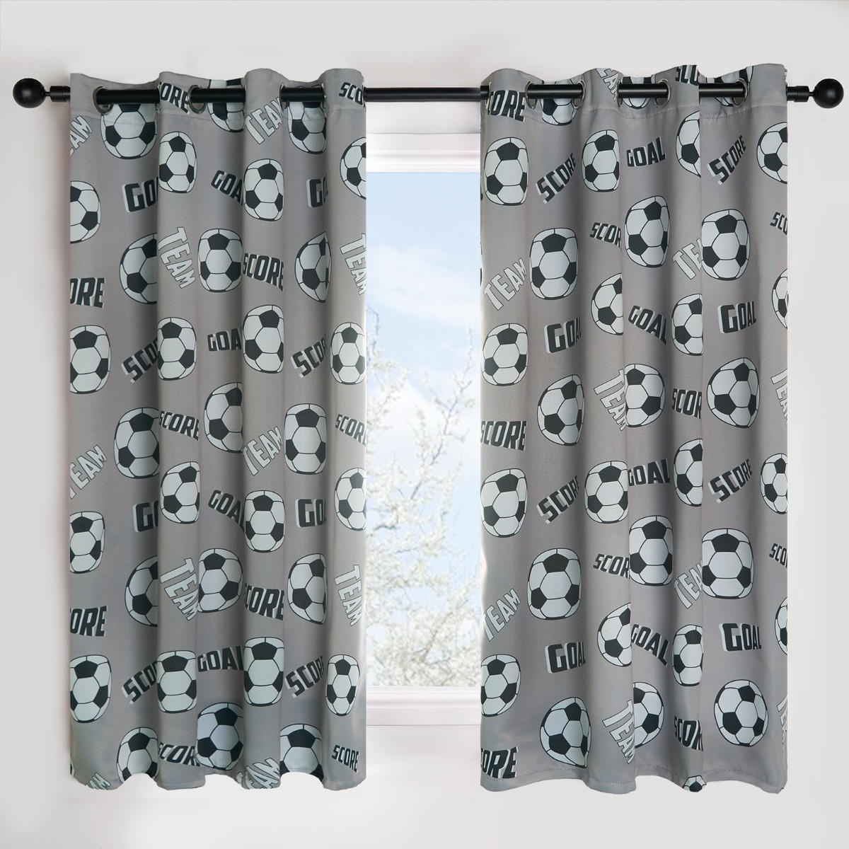 The OHS Kids Football Blackout Curtains feature a grey background adorned with footballs and exciting words like "Goal," "Score," and "Team." Perfect for young football enthusiasts, these curtains add energy and fun to any football enthusiasts bedroom while providing effective light-blocking for a restful night’s sleep.