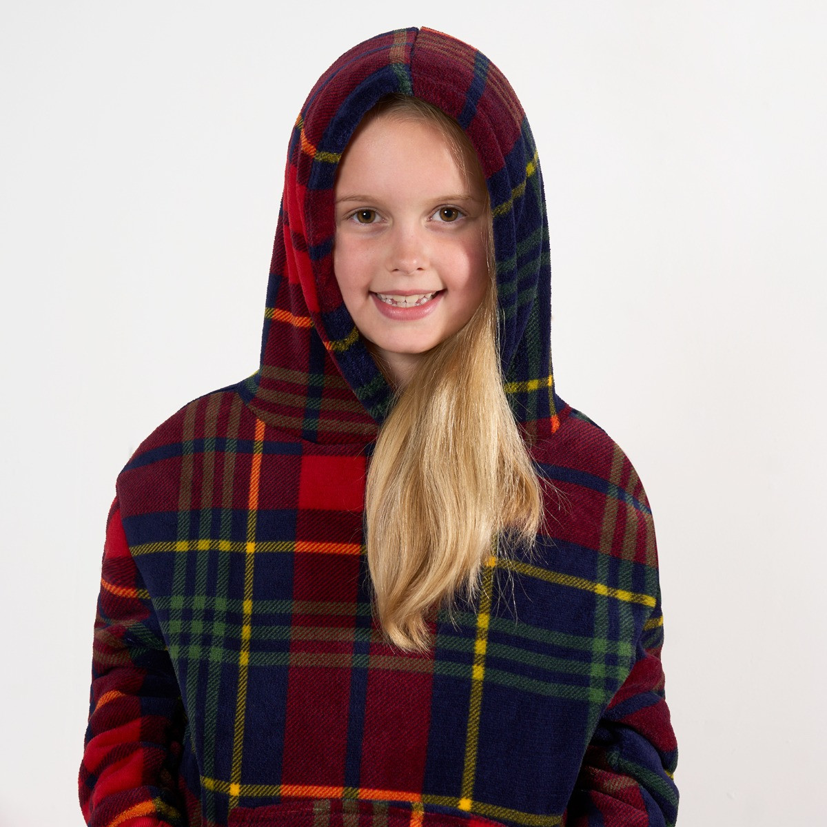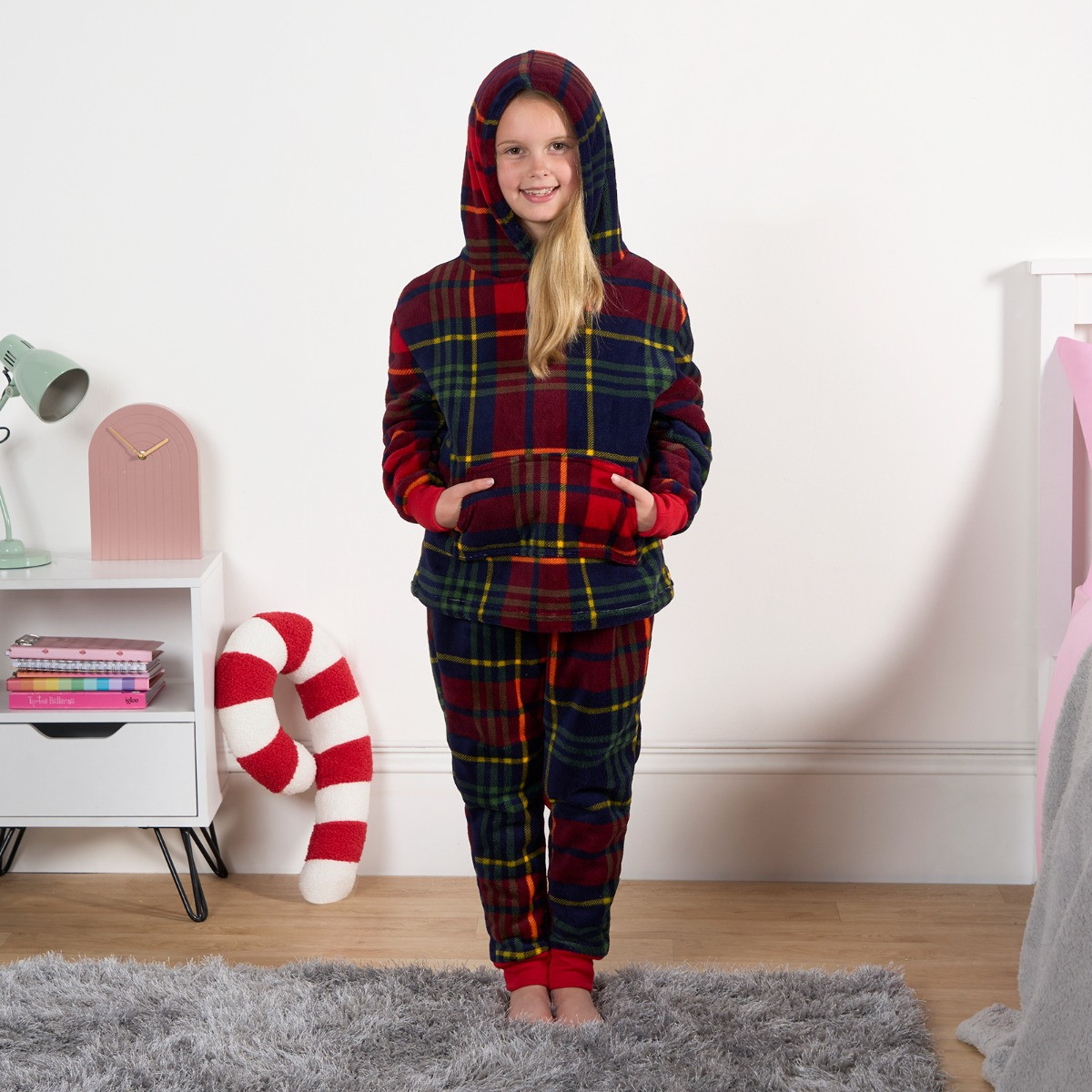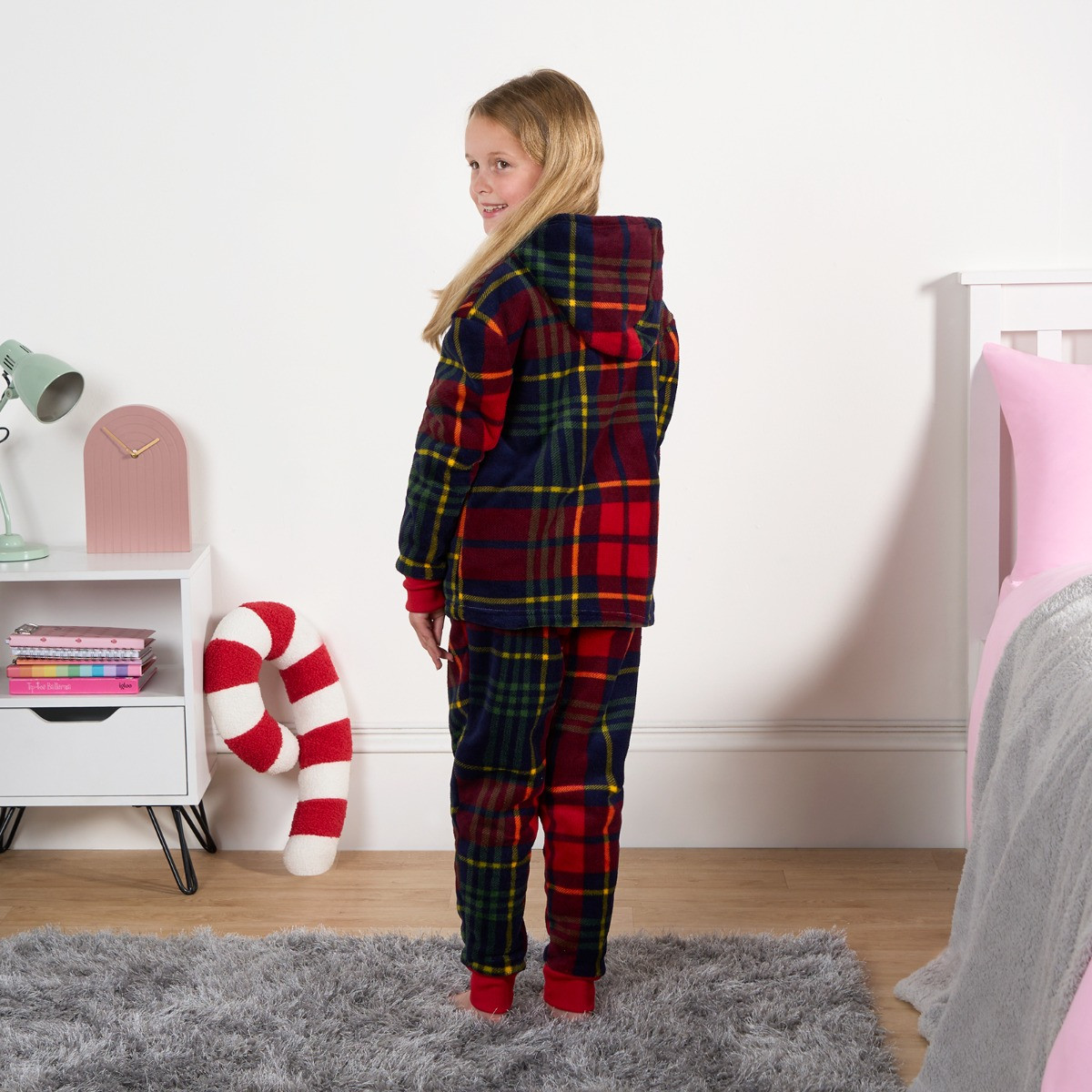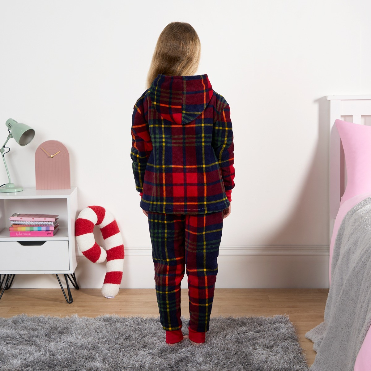 OHS Kids Oxford Check Fleece Hoodie Pyjama Set, Navy/Red - Small