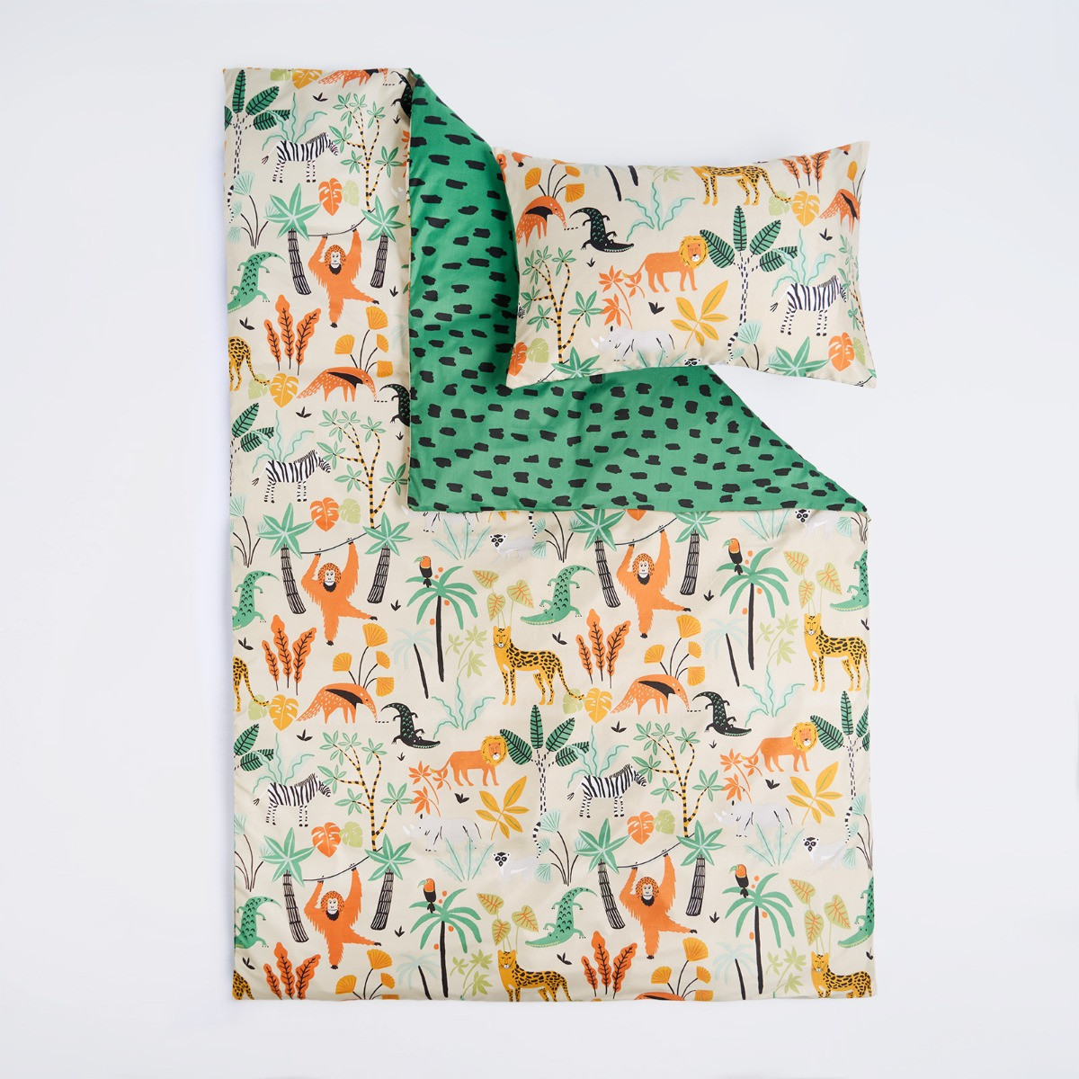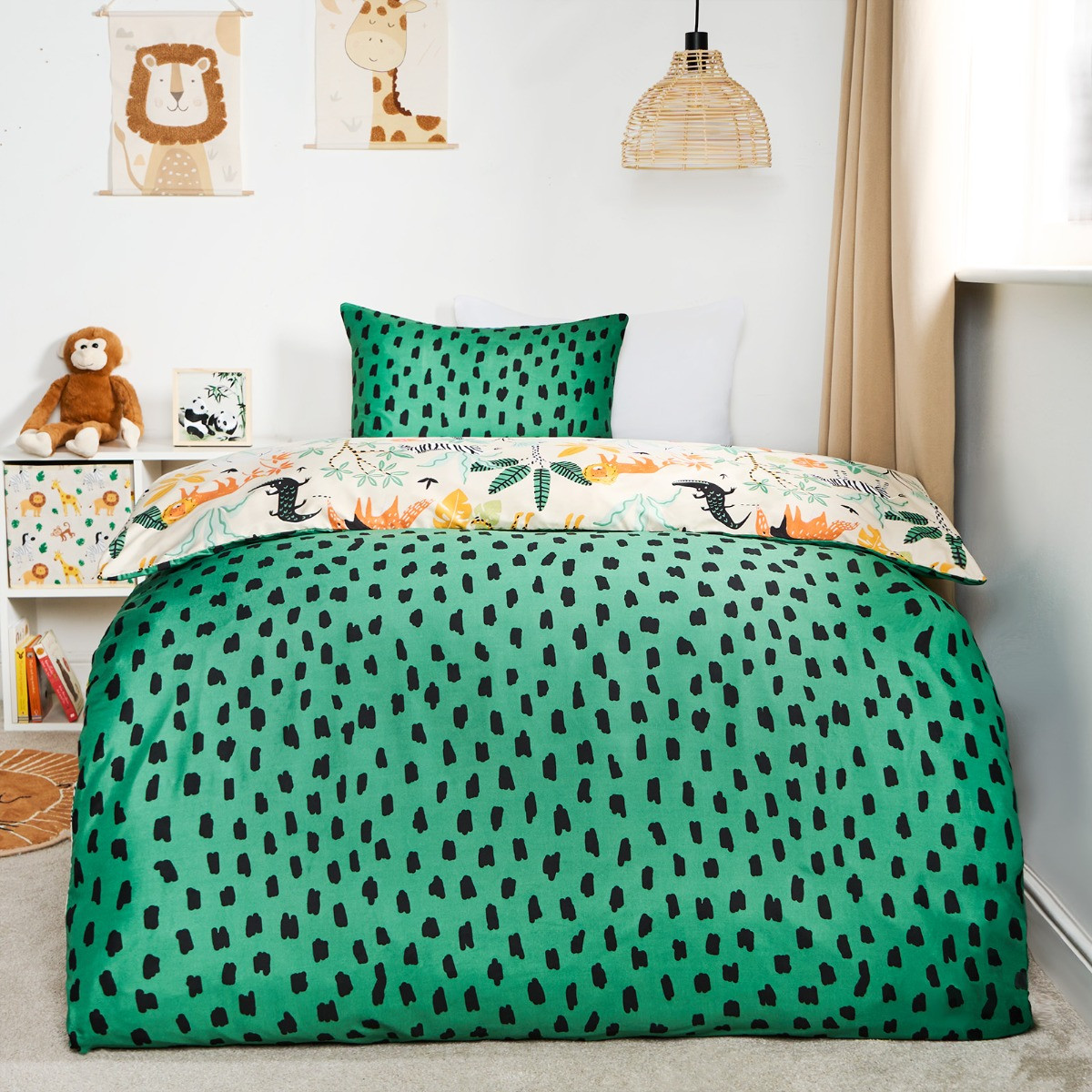 The OHS Kids Safari Print Reversible Duvet Cover Set brings the exciting world of the savannah right into your child's bedroom. One side of the duvet cover boasts a vibrant safari print, showcasing a lively assortment of animals including lions, monkeys, crocodiles, zebras, and more, all set against a neutral tan background. To switch up the decor, simply flip the duvet cover to reveal a striking bright green backdrop adorned with black animal spots, adding a bold and playful touch to the room. Crafted from quality materials, this reversible duvet cover set offers both style and comfort for a restful night's sleep. Whether your child dreams of wild adventures or simply loves animals, this bedding set combines imagination, colour, and comfort to create a captivating safari-inspired bedroom atmosphere. Perfect for young explorers and animal lovers alike! Available in the following sizes: