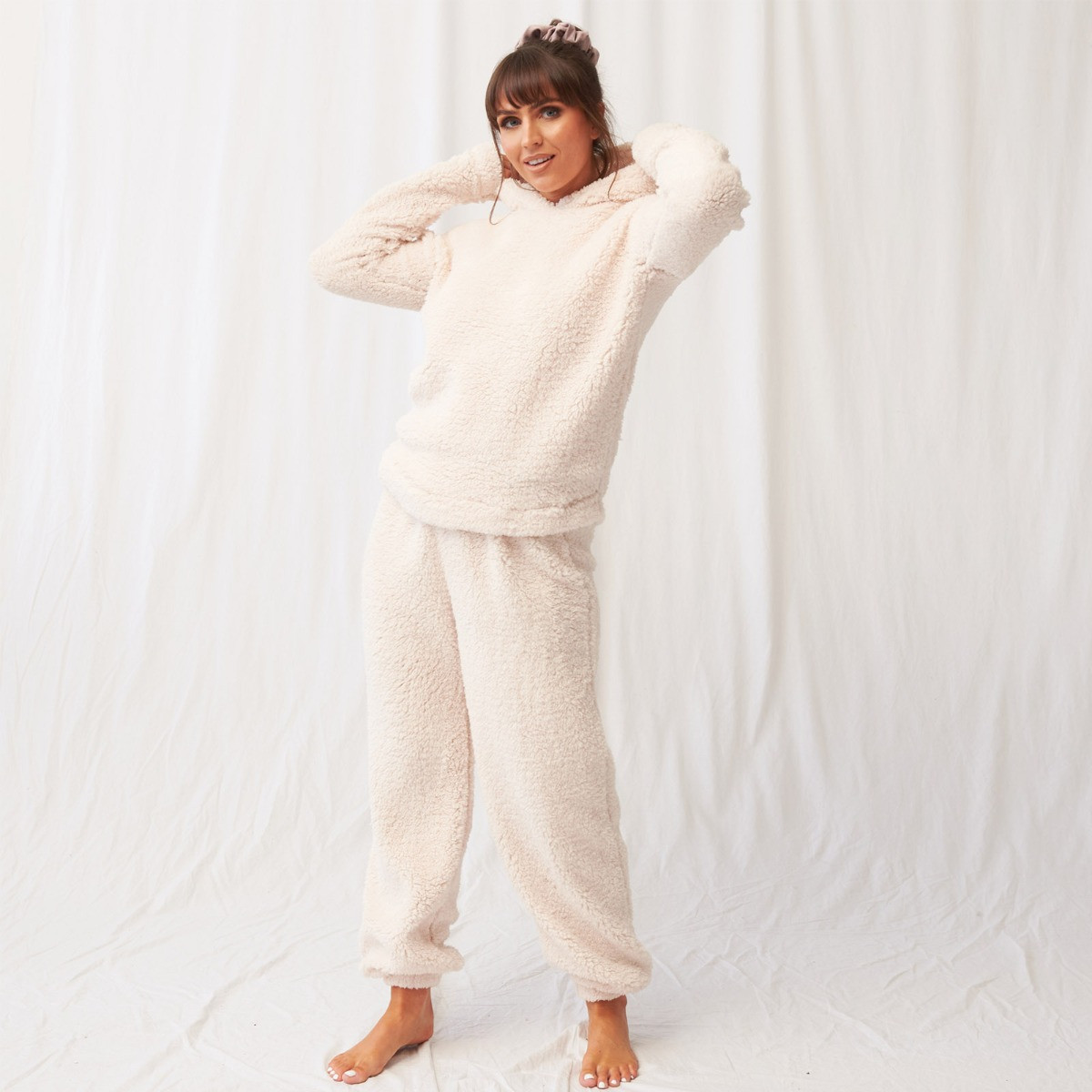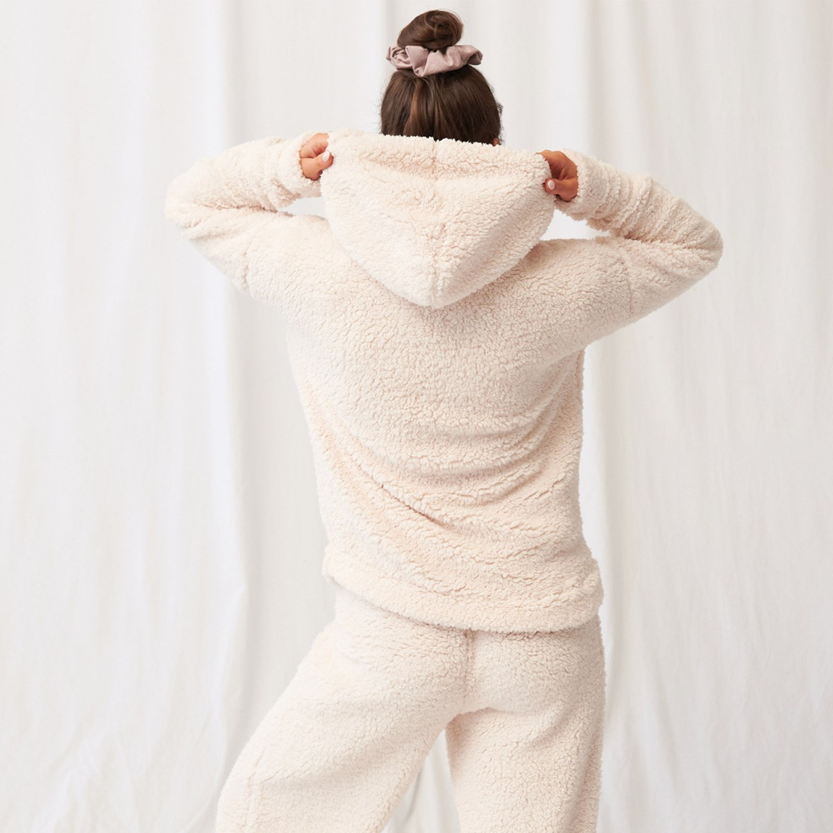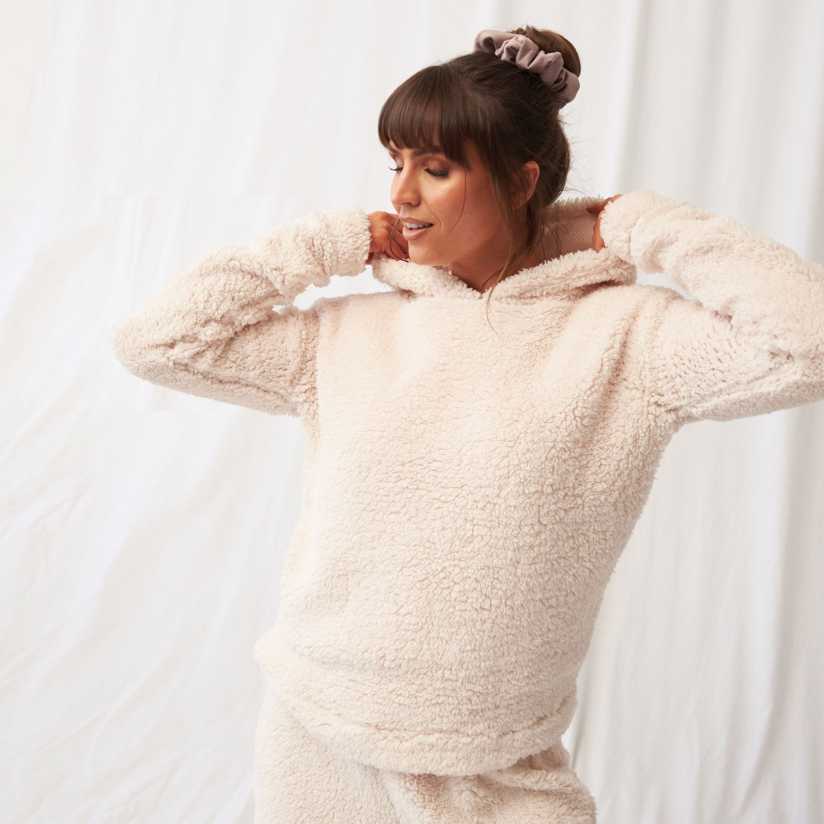 Keep your loungewear seriously chilled with this cute and cosy cream hoodie. Featuring the fluffiest teddy borg material, our hoodies make the perfect lounging around outfit and the cutest nightwear. For head to toe comfort style with our matching teddy joggers.