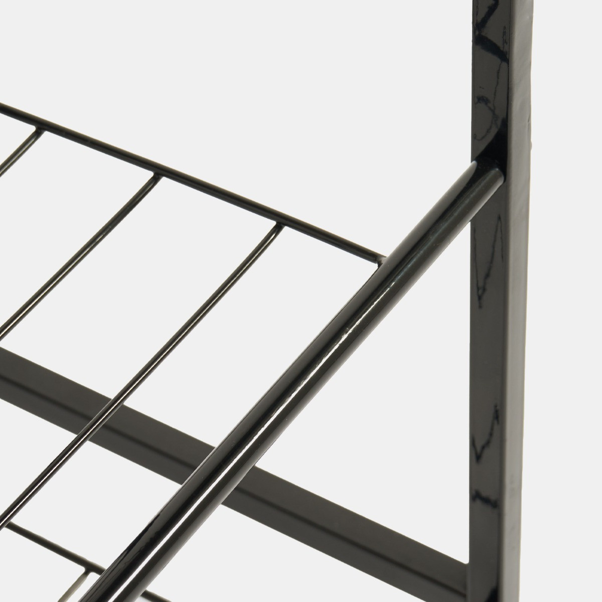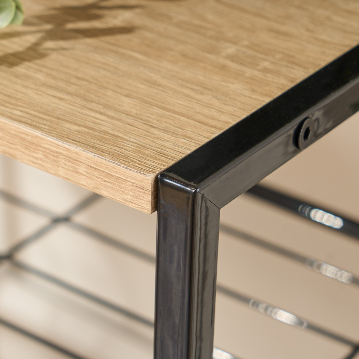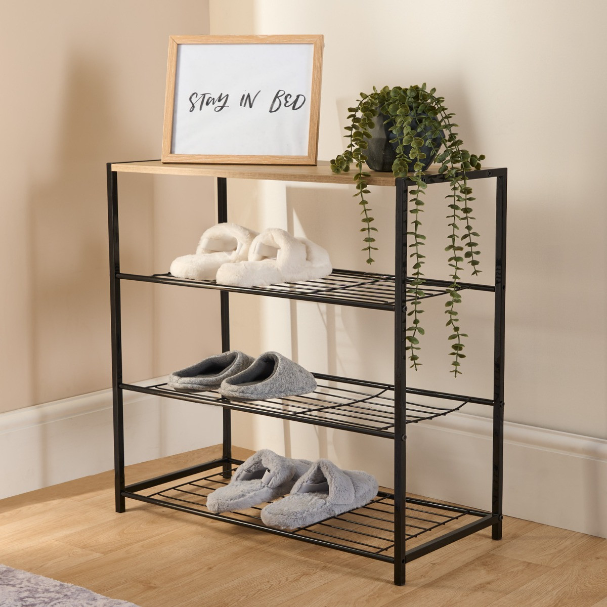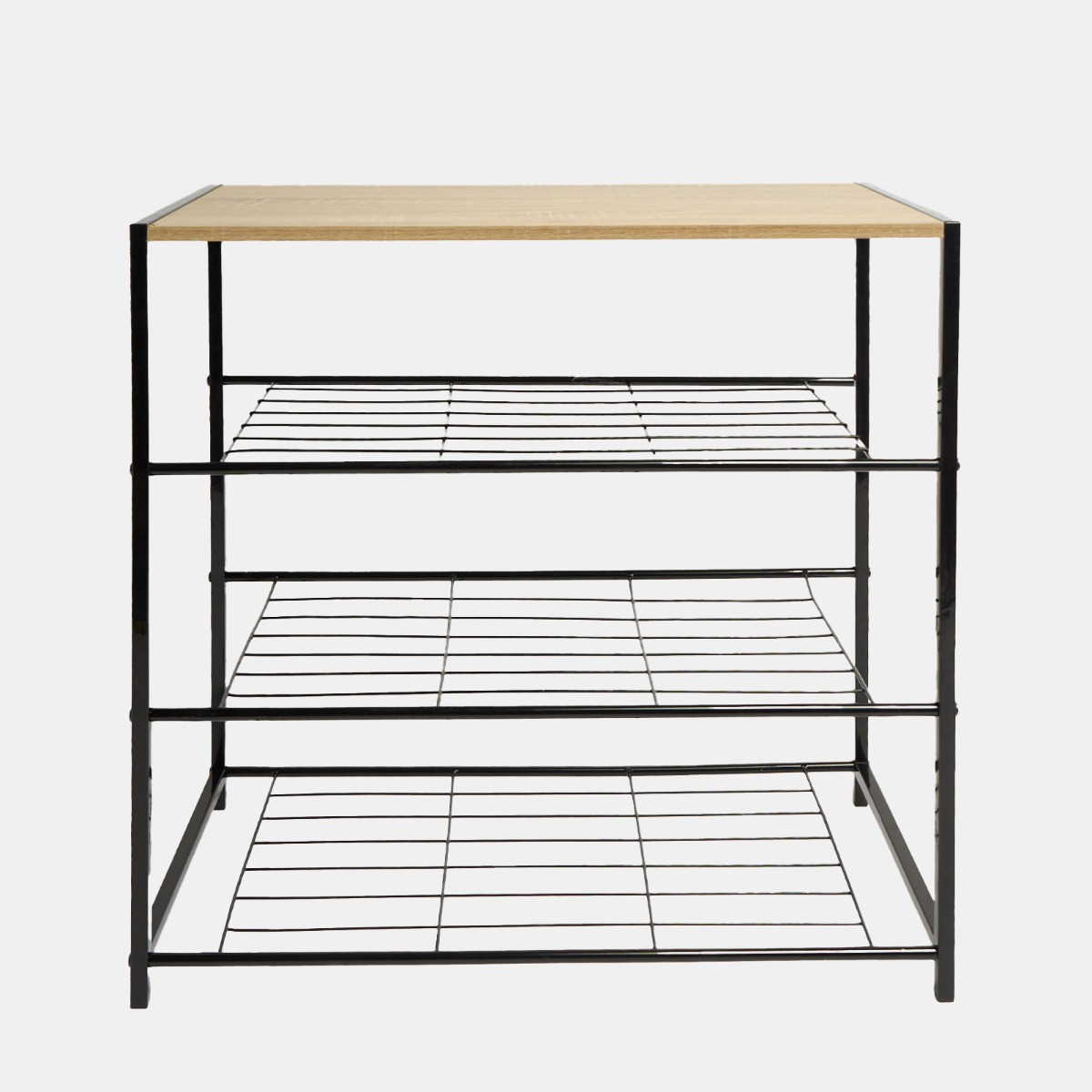Enhance your home organisation and style with the OHS Manhattan 4-Tier Shoe Rack. This versatile storage solution combines the warmth of wooden shelves with the sleekness of a black metal frame, making it an ideal choice for any room that needs both functionality and flair. Featuring a chic, wooden top shelf, a sturdy black metal frame and tiers, this storage unit adds a sophisticated touch to your decor. The natural wood tones complement the modern black frame, creating a stylish contrast.