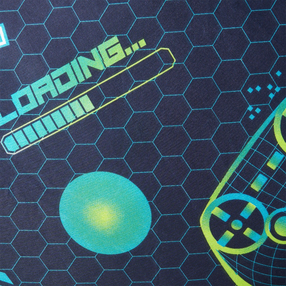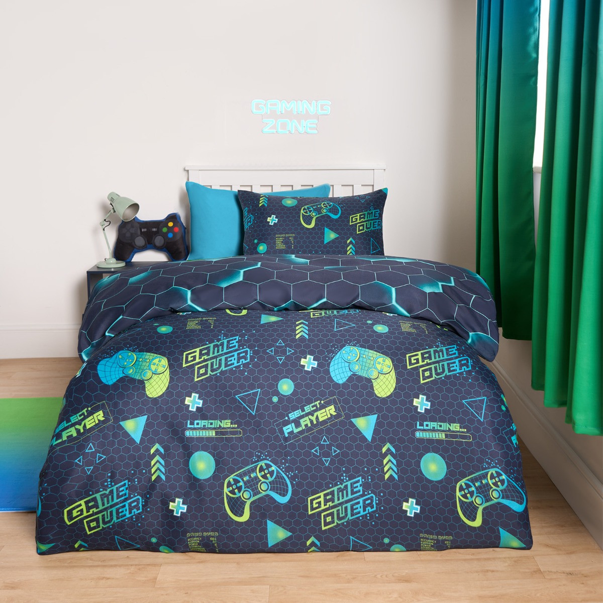Introducing the OHS Neon Gaming Honeycomb Reversible Duvet Cover Set, designed to elevate any gaming enthusiast's bedroom. This vibrant set features bold neon green and blue accents against a sleek black backdrop, adorned with fun gaming graphics such as controllers and action phrases. The eye-catching design brings a playful and energetic vibe, perfect for young gamers. Made from soft, durable fabric, this duvet set ensures maximum comfort and practicality, making it an exciting addition to your child's space.