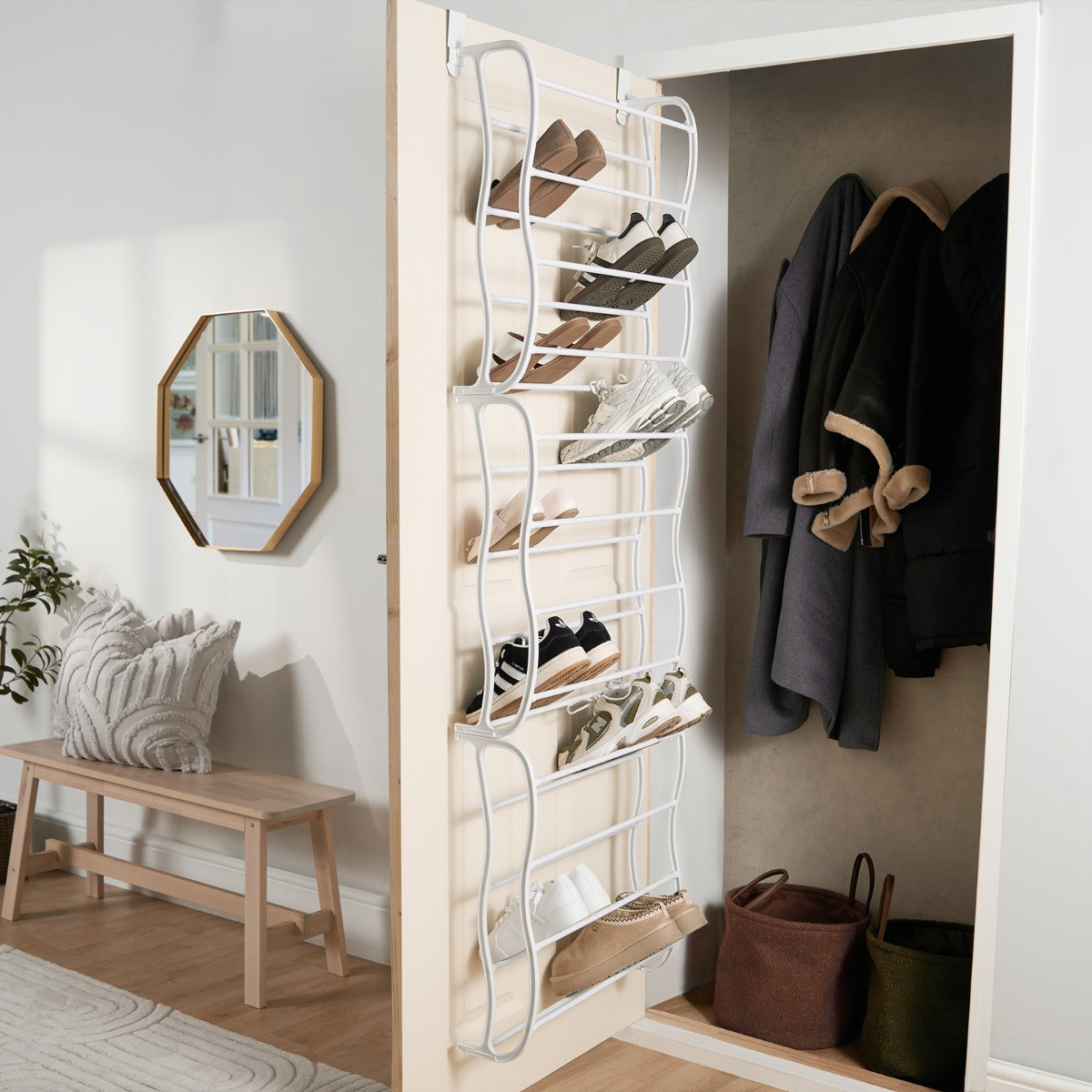The OHS Over the Door Shoe Rack is a practical and space-saving solution designed to keep your footwear neatly organised. With a sleek metal finish, this rack blends seamlessly with any room decor, offering both functionality and style. The rack easily hangs over most doors, allowing you to maximise space without the need for complex installation. It features multiple tiers to accommodate a variety of shoe sizes, from sneakers to heels, helping to keep your shoes within easy reach and neatly stored. Perfect for homes with limited storage space, this over-the-door shoe rack is a must-have for a tidy, clutter-free entryway or closet.