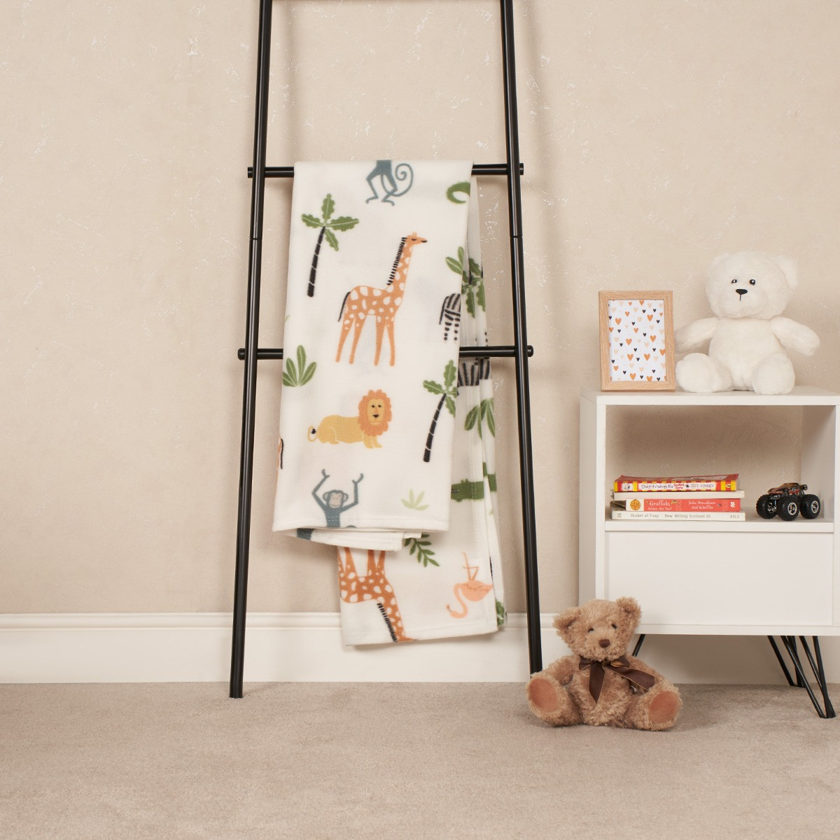 The OHS Safari Fleece Throw is a joyful and cosy addition to your home décor. This plush and incredibly soft touch throw blanket is adorned by captivated scenes of wild animals, including majestic lions, elegant giraffes, playful monkeys, stealthy crocodiles, striking zebras, and vibrant flamingos, complemented by lush foliage that adds a touch of the wild life to your space. Whether you're snuggled up on a chilly evening or adding a decorative accent to your living area or kids room, this throw brings the untamed beauty of the safari right into your home.