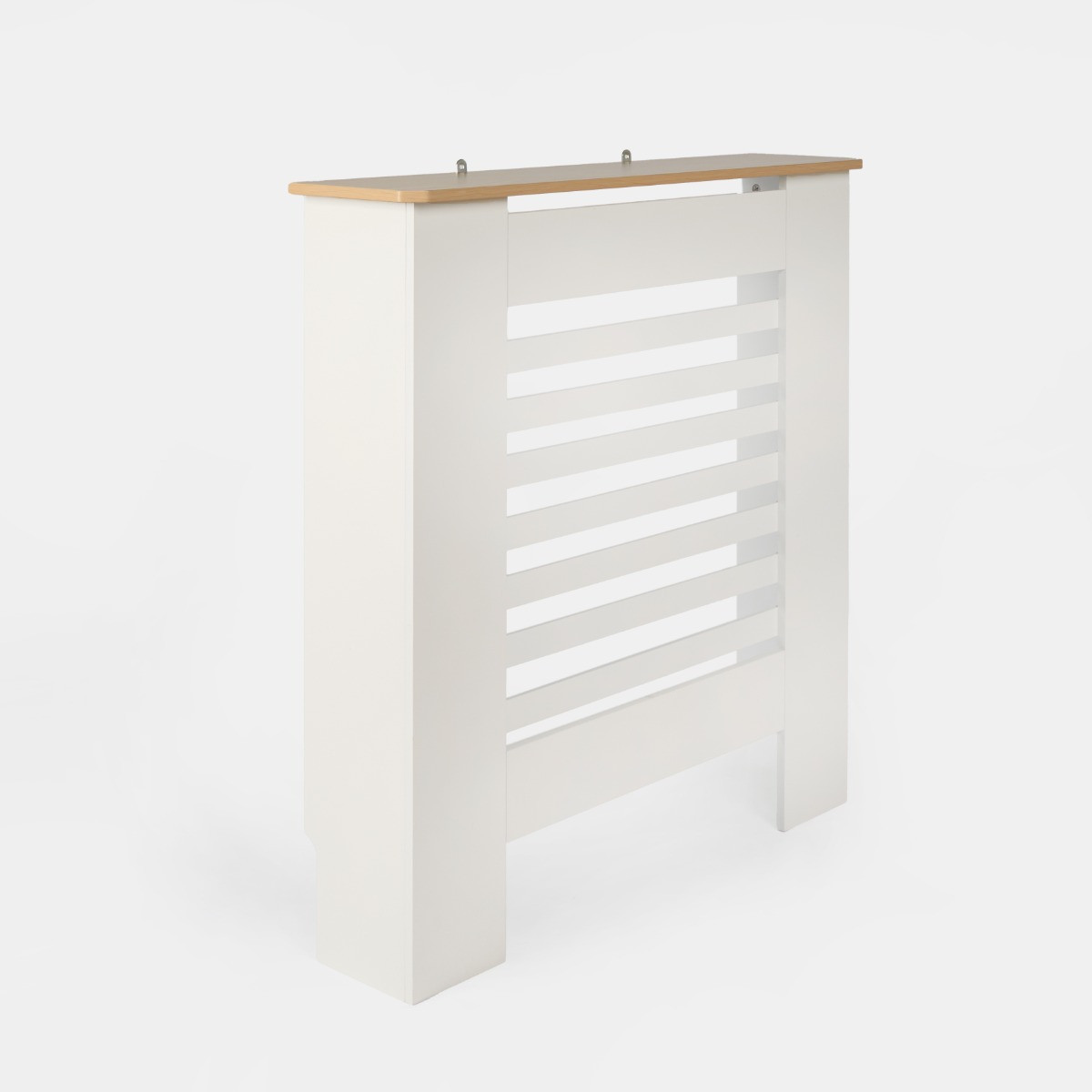 The OHS Wooden Radiator Cover with Oak Look Top is a stylish and practical solution to enhance your home's interior while maximising space and safety. Featuring a sleek finish and clean lines, this radiator cover seamlessly blends with any decor style, from modern to traditional. The slanted front makes for a minimalist design that adds a touch of sophistication to your rooms while allowing for optimal heat flow, ensuring your space stays warm. Perfect for living rooms, bedrooms, and hallways, this versatile piece also offers extra surface space for décor items or storage.