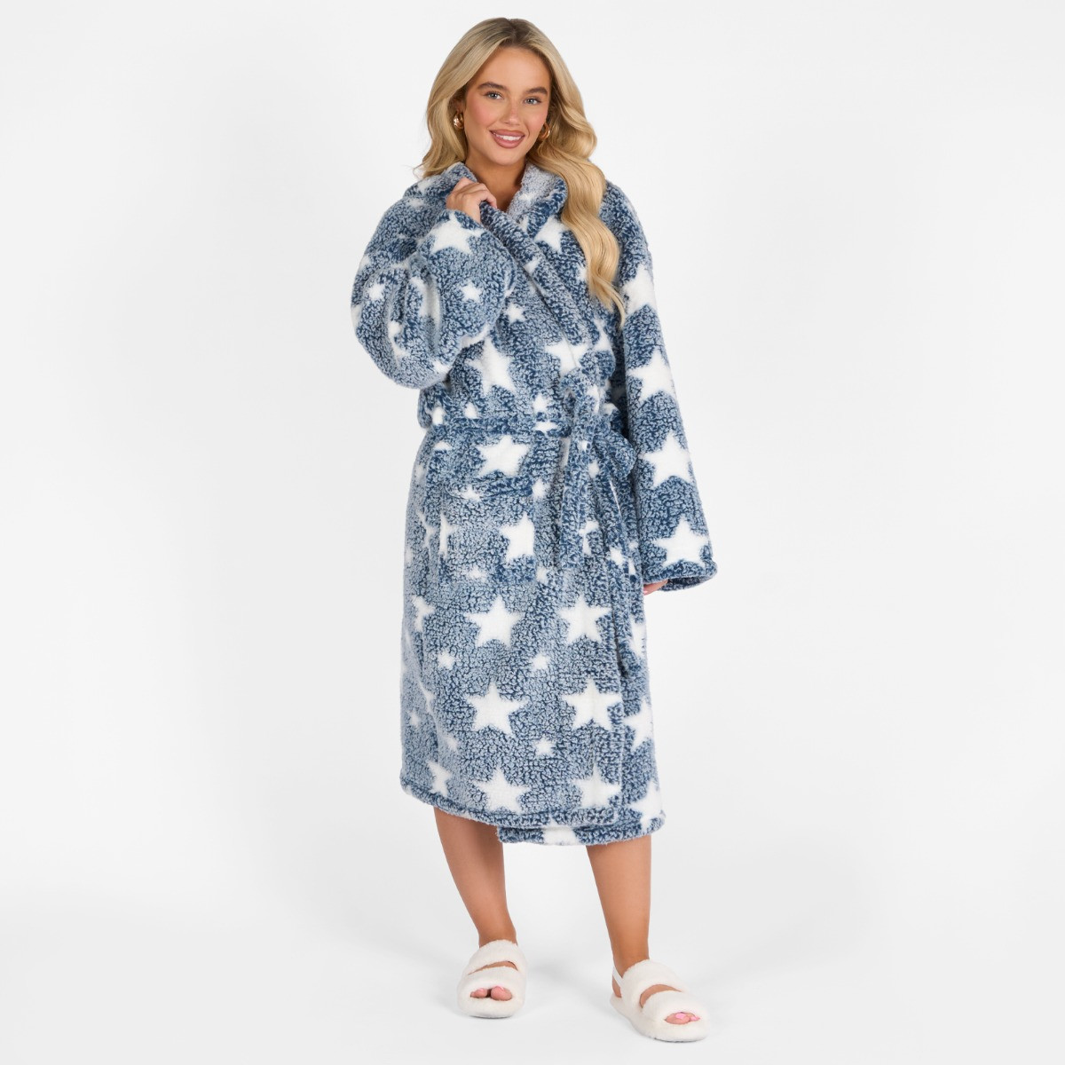 OHS Star Print Teddy Marl Dressing Gown, Adults - Navy