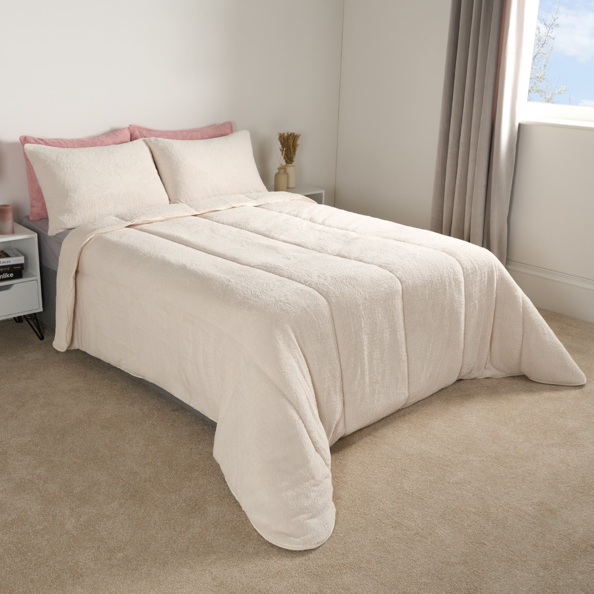 Introducing the Teddy Coverless 10.5 Duvet & Pillowcase(s), a luxurious and cosy bedding solution. This coverless duvet set features a sumptuously soft and plush texture that mimics teddy fur, providing a snuggly haven for a restful night’s sleep. Its 10.5 tog ensures you stay comfortably warm during the cooler nights without feeling overly hot in the warmer seasons. This set includes matching pillowcases, adding a touch of elegance and uniformity to your bedroom décor. This design simplifies your bedding routine, making it easy to change and clean without the hassle of a duvet case. Whether you are looking to elevate your own sleeping experience or seeking a thoughtful gift, this set combines comfort and style for the perfect night’s sleep. Available in the following sizes:-