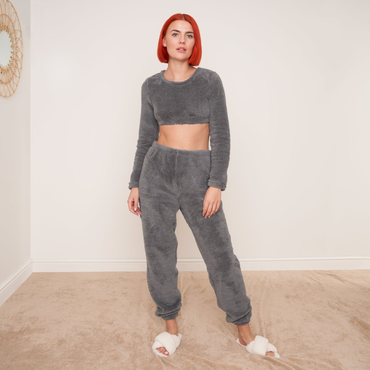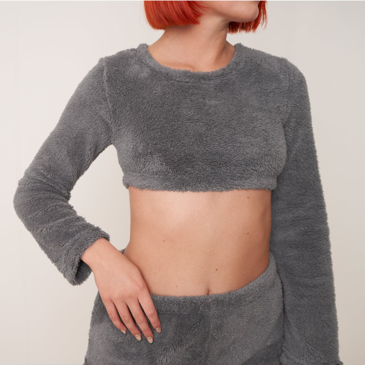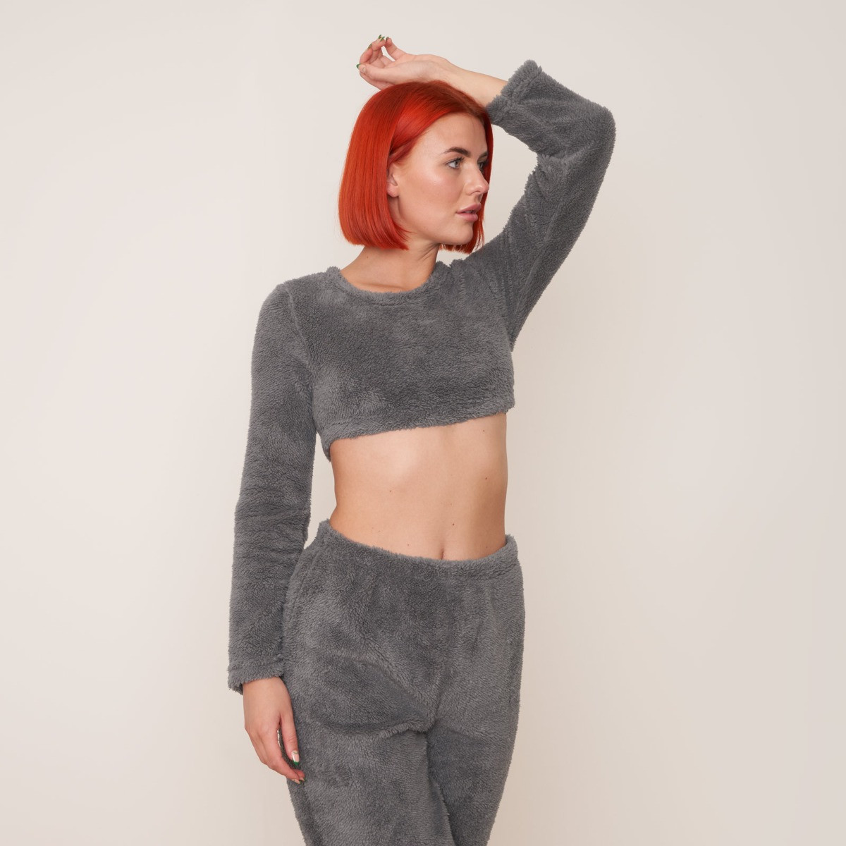 Comfy, stylish and cosy, our teddy fleece cropped top is soft and cosy, making it perfect for lounging around, for use as nightwear, or even for the ultimate working from home look. This item features a scoop neck line and long sleeves.
