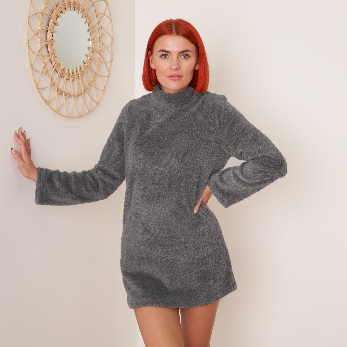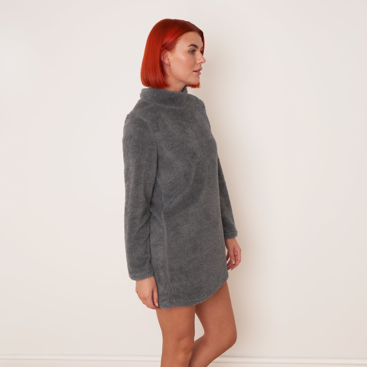 Enjoy a combination of comfort and style with our teddy fleece dress is soft and cosy, featuring a high neck line and long sleeves. Making the item perfect for lounging around, for use as nightwear, or even for the ultimate working from home look.