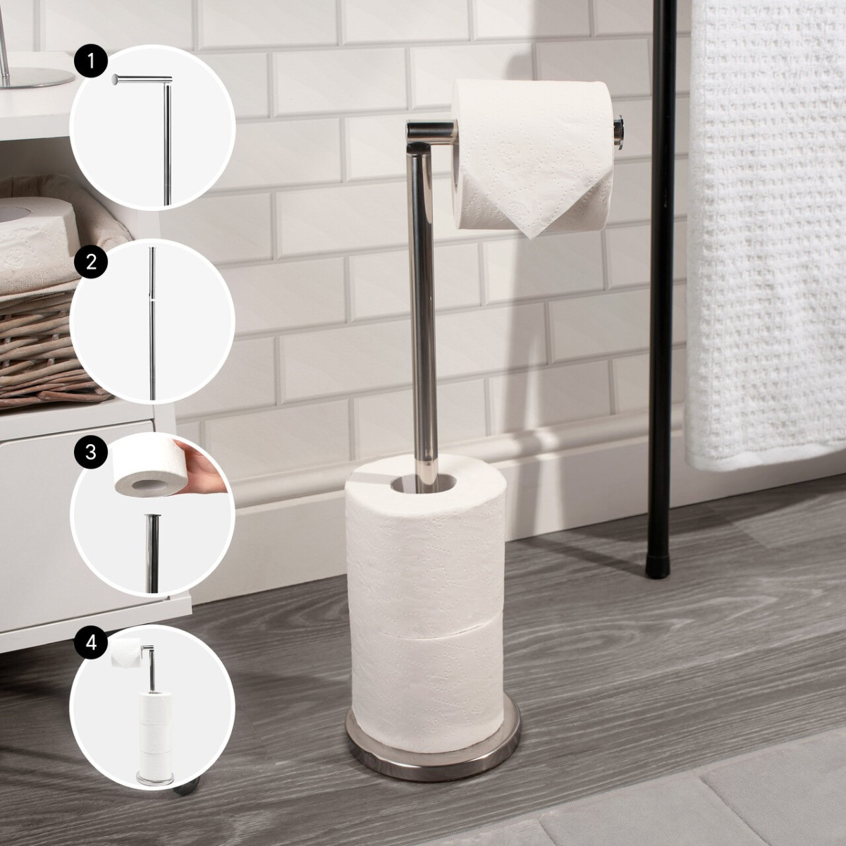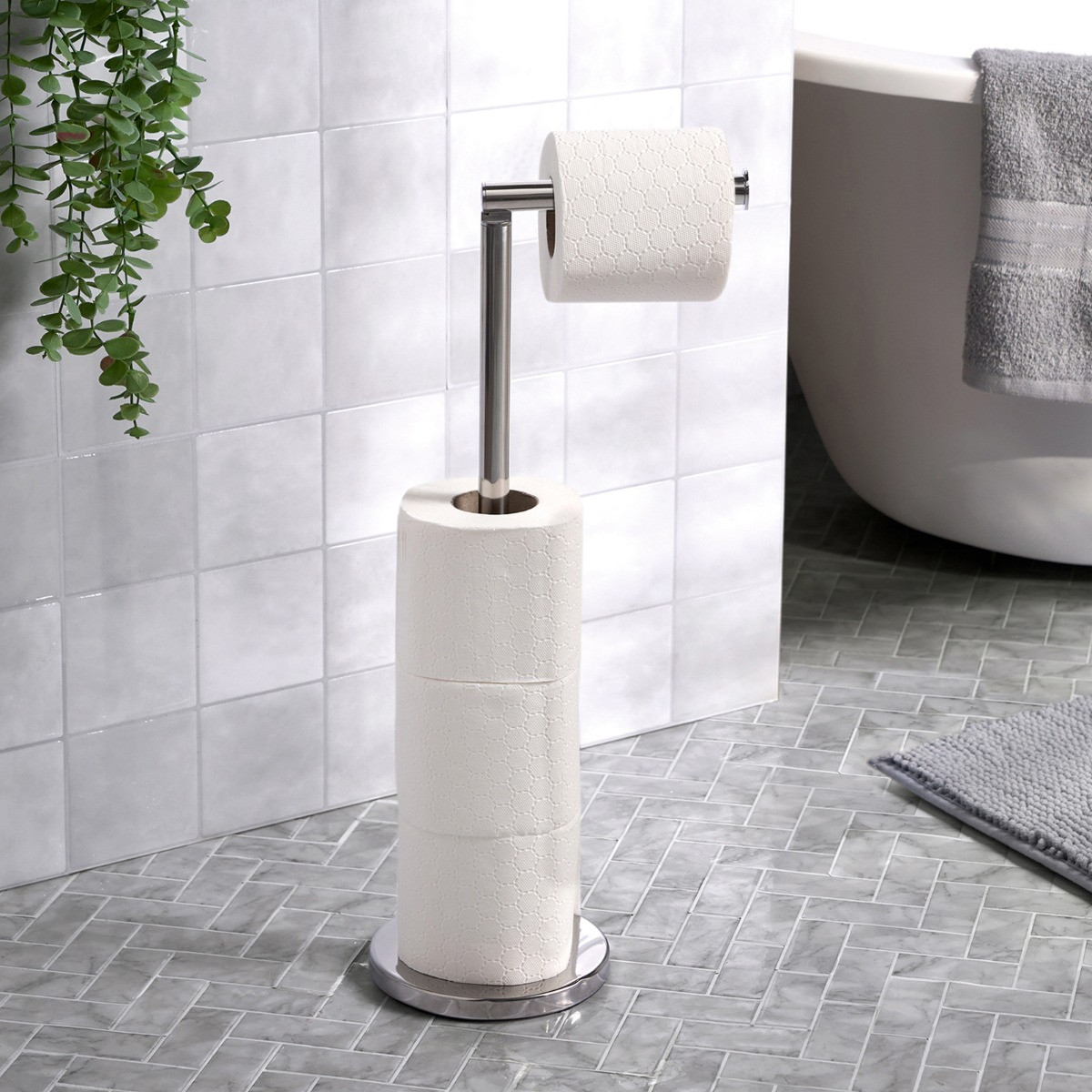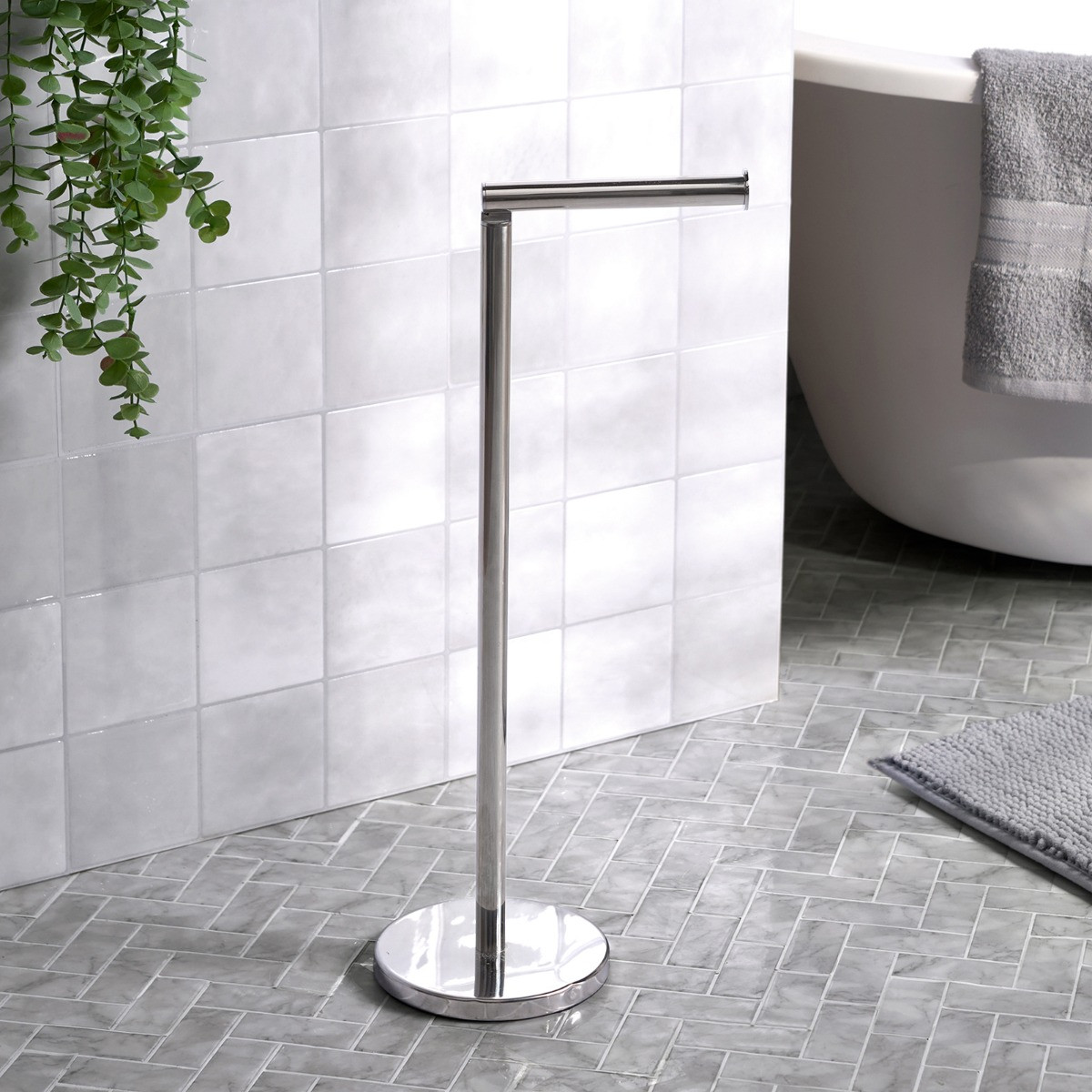 Introducing the Toilet Roll Free Stand Holder from OHS! This sleek and space-saving solution provides a sturdy and portable base that holds your toilet roll paper within easy reach. This freestanding design negates the need to attach anything to your wall, offering convenience and ease. Crafted from high-quality and durable materials, this holder not only ensures your toilet paper is always to hand but also provides your bathroom a visual touch of sophistication. Say hello to functional elegance with this practical accessory.
