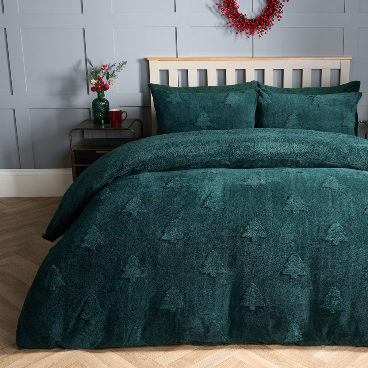 OHS Winter Tree Tufted Teddy Fleece Duvet Cover Set - Forest Green
