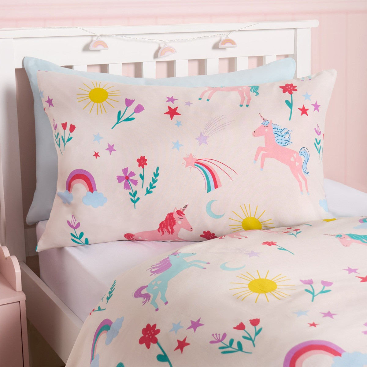Transform your little one's bedroom into a magical dreamland with the OHS Unicorn Magic Reversible Duvet Set in Pink and Blue. Featuring a whimsical unicorn-themed design on one side and a pastel-colored reversible option on the other, this duvet set brings enchantment and versatility to their space. Perfect for young unicorn lovers, it creates a cosy, imaginative atmosphere where dreams can take flight. This fun and vibrant bedding set is crafted for comfort, making bedtime a magical experience every night.