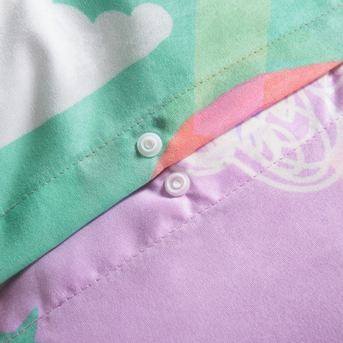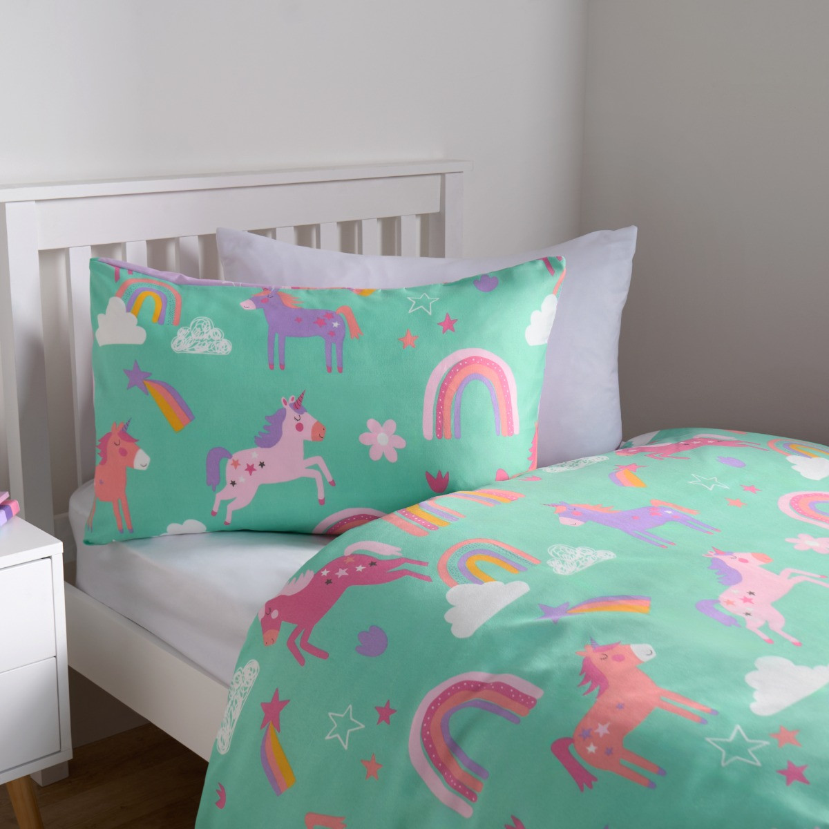 Introducing the OHS Unicorn & Rainbows Reversible Duvet Cover Set, designed to enchant and delight. Each side features whimsical, stylised unicorns and rainbows, one side against a fresh minty green background, and the other againsy a vibrant purple - each adding a magical and versatile touch to any room. Crafted from soft fabric, this duvet set ensures a cosy and comfortable sleep experience. Perfect for adding a splash of fantasy and fun to your child's bedroom, the OHS Unicorn & Rainbows Reversible Duvet Set brings both charm and comfort.