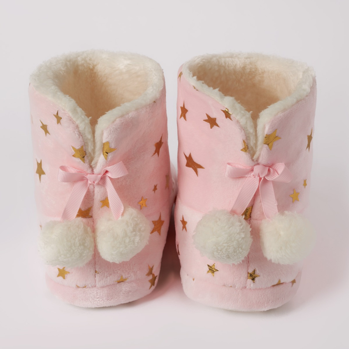 Comfy, stylish and snuggly, our star boot slippers are soft and cosy, making them perfect for lounging around or even for the ultimate working from home look. This cosy pair of boot style slippers has a Sherpa lining for a cosy, snug fit, the outer material is a suede fleece material. These boot slippers also feature an added bow and pom poms on the back for the perfect finish. They have been crafted with a rubber sole for durability and comfort.