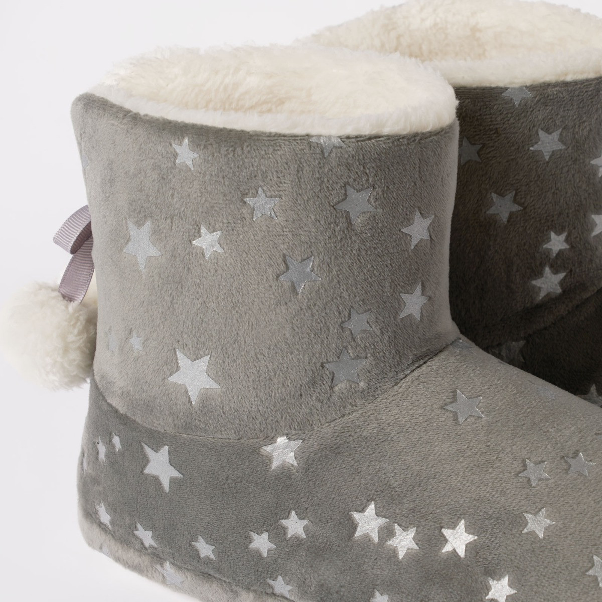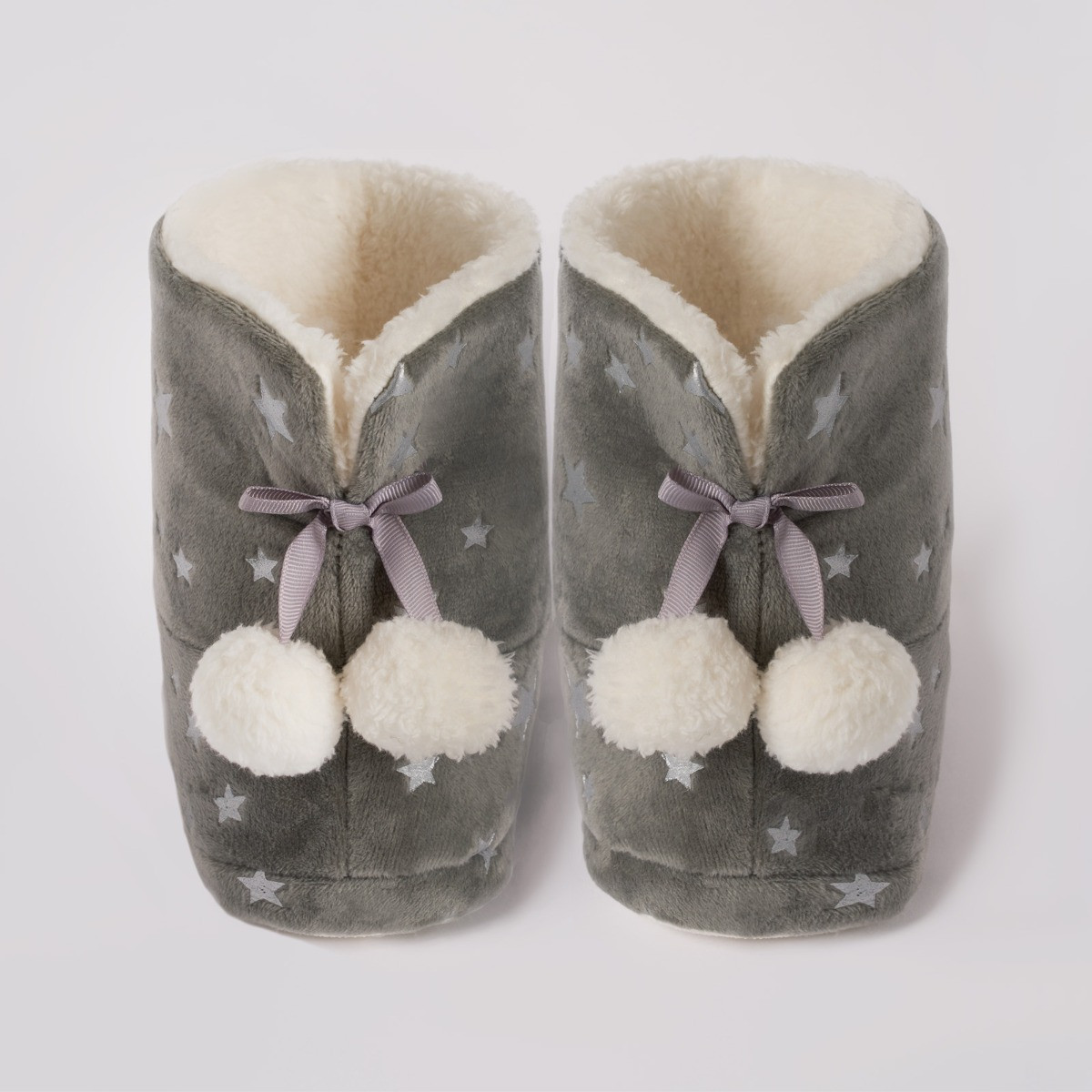 Comfy, stylish and snuggly, our star boot slippers are soft and cosy, making them perfect for lounging around or even for the ultimate working from home look. This cosy pair of boot style slippers has a Sherpa lining for a cosy, snug fit, the outer material is a suede fleece material. These boot slippers also feature an added bow and pom poms on the back for the perfect finish. They have been crafted with a rubber sole for durability and comfort.