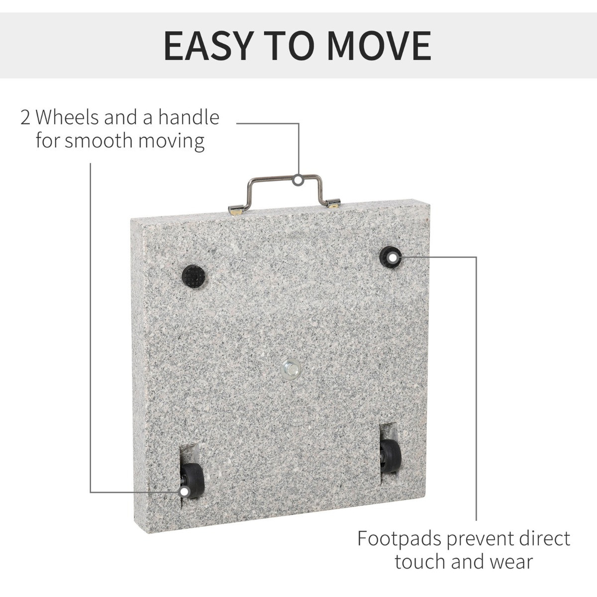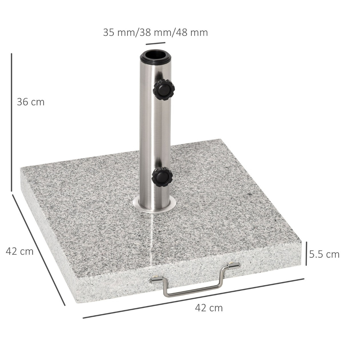 This stylish base is a perfect accessory to have to complete your parasol. The base is made from marble with a metal upright to hold the parasol. It can accommodate most poles from 3.4cm / 3.8cm / 4.8cm. As the base is made of marble it is heavy and to make it easier to move around there is a handle and wheels on the sides to make it effortless to relocate. A great product to have in your garden or patio, this will complete your garden set.