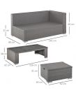 Contents: 3 x Double Corner Sofa, 1 x Coffee Table, 2 x Footstool, 6 x Seat Cushion, 2 x Footstool Seat Cushion, 7 x Back Cushion