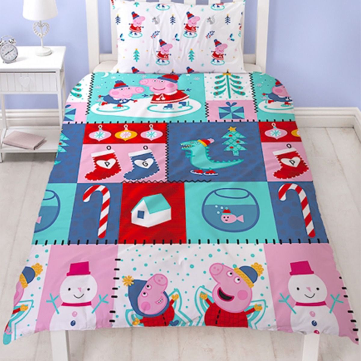 Bring the magic of Peppa Pig's winter wonderland into your child's room with the Peppa Pig Reversible Snowman Duvet Set. On one side, your little one will find Peppa, George, Dinosaur, and a jolly snowman surrounded by festive Christmas motifs. When it's time for a change, flip it over to reveal a cheerful repeating pattern of Peppa ice skating. This reversible duvet set is the perfect way to create a cozy and whimsical atmosphere for your child during the holiday season. Let Peppa Pig and her friends make bedtime extra special with this adorable and festive bedding.