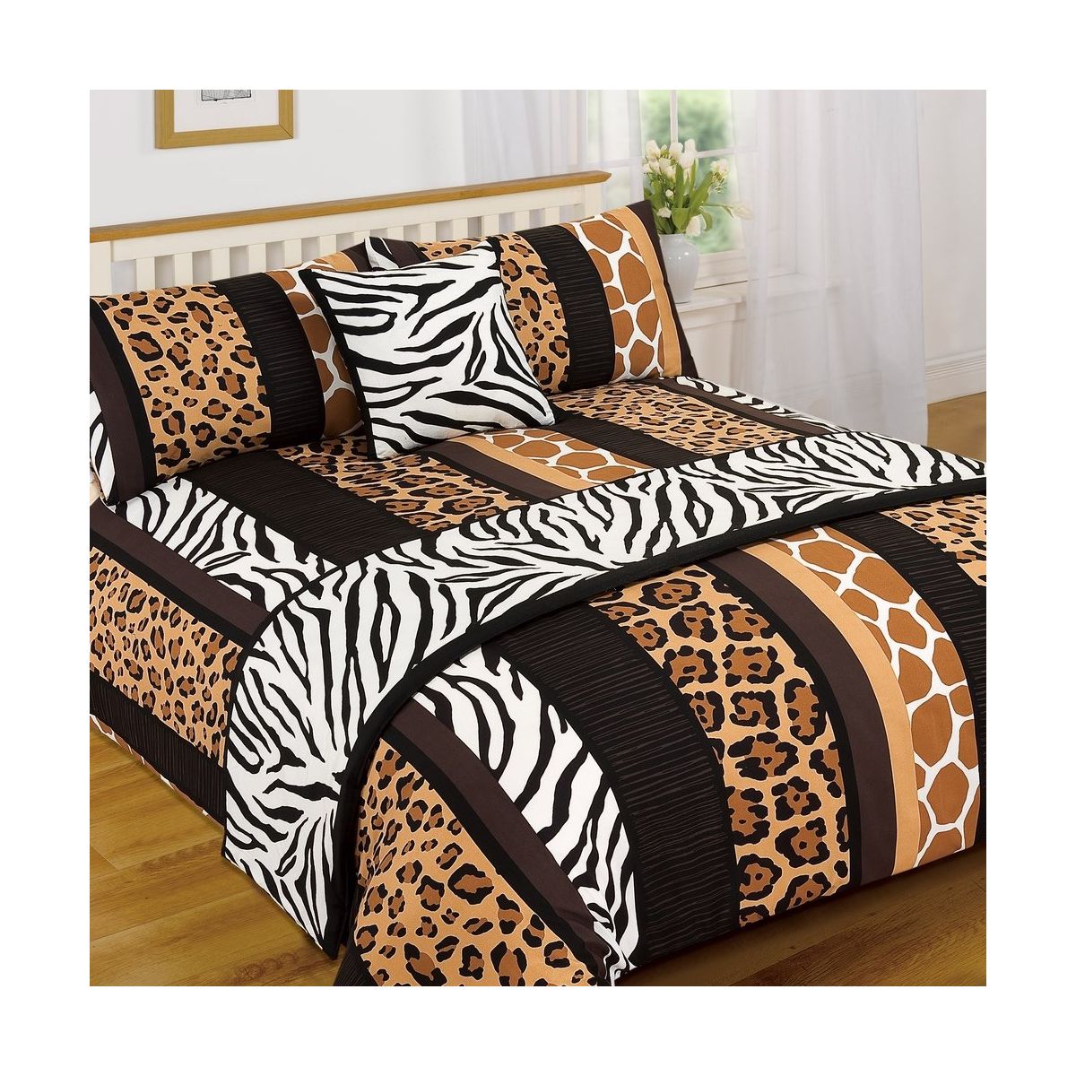 This luxurious complete bedding set has everything you need to add comfort and style to any bedroom. This easy-care bed linen is an essential everyday purchase for every home as it is machine washable and is tumble dry friendly. With its leopard animal print design, this Serengeti bedding set, complete with duvet cover and matching pillow case, bed runner and cushion cover will be sure to complement your bedroom. Once washed it has great resistance to wrinkles, fading and shrinkage:-