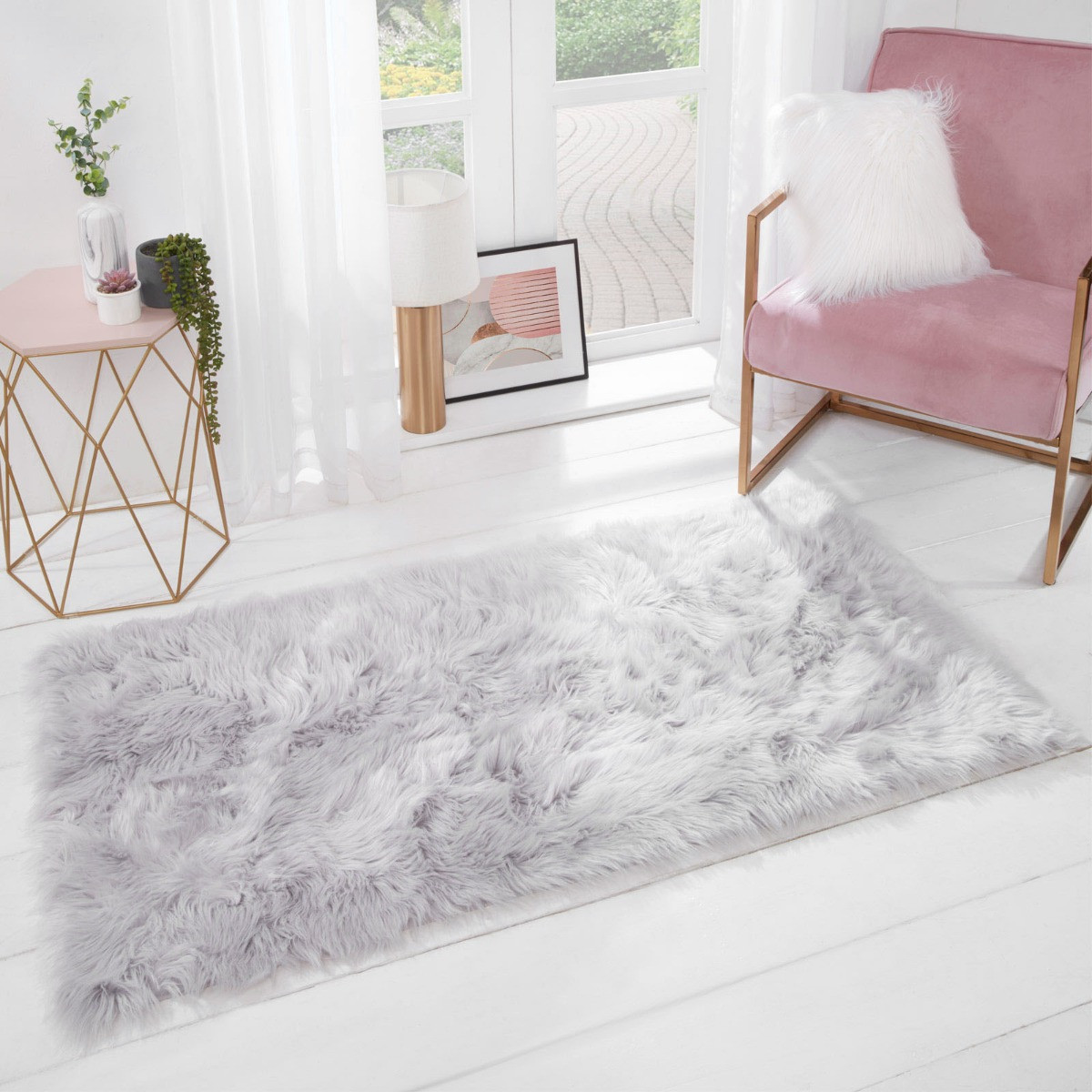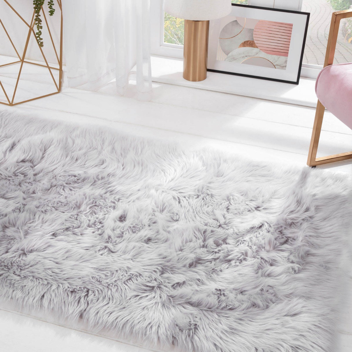 OHS Faux Fur Sheepskin Rug, Rectangle - Silver