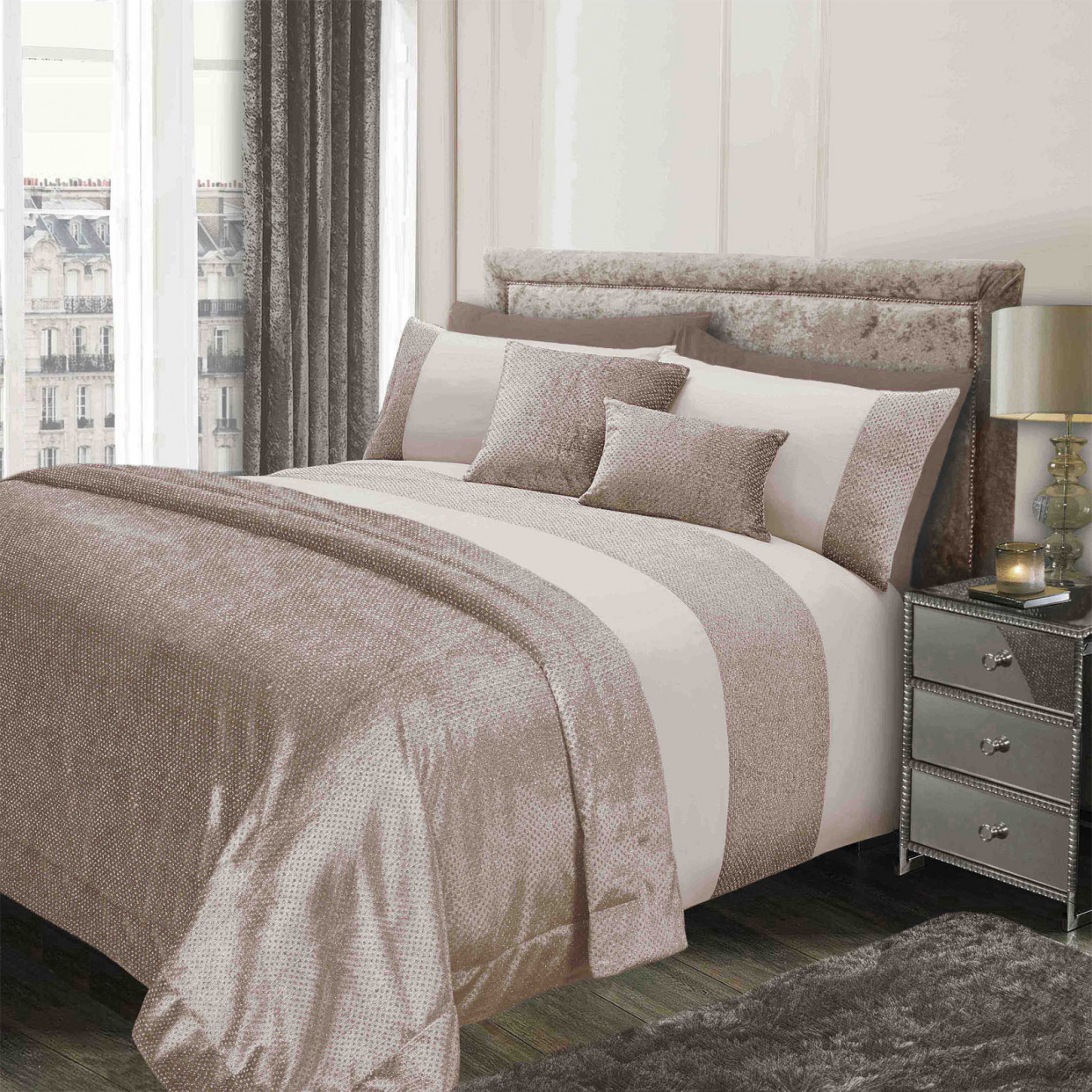 Colour: Available in a silver grey, gold champagne/cream or blush pink with glitter velvet.