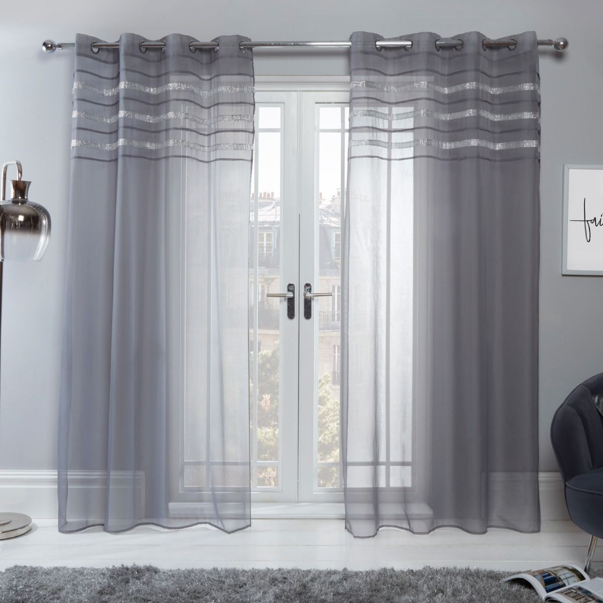 OHS Latina Diamante Voile Net Eyelet Curtains , Charcoal Grey - 55" x 87"