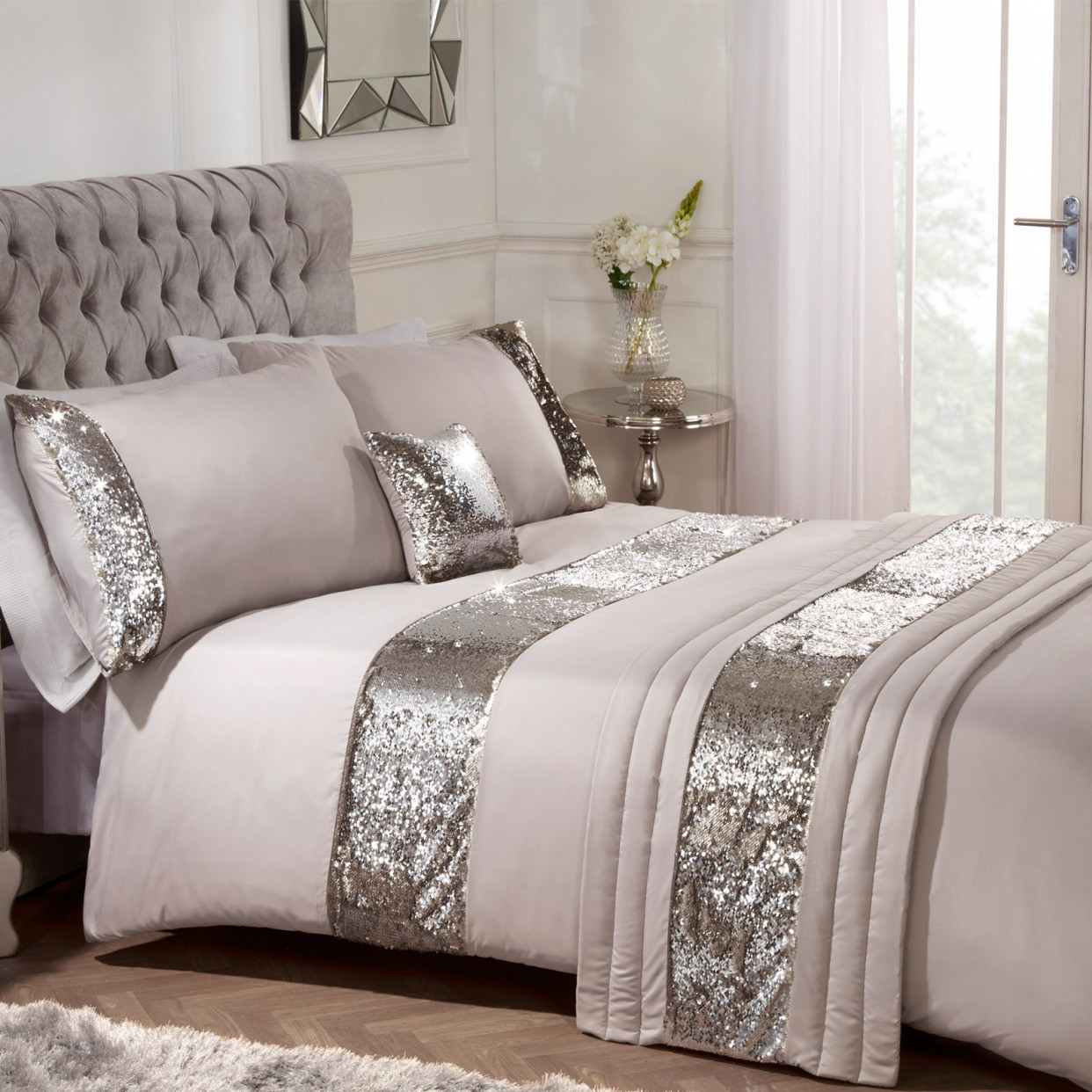 This OHS bed in a bag has everything you need to add comfort and luxurious style to any bedroom. The mermaid sequin design will add some sparkle to your room, with a shimmer effect on a band running across the width of the bedding. A natural plain mink colour face work together to make this bedding look modern and stylish. Once washed it has great resistance to wrinkles, fading and shrinkage. This easy care set is complete with a duvet cover, matching pillow case(s), filled cushion and bed runner, providing all you need to style your room.-