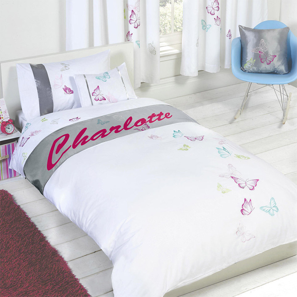 This personalised duvet cover set has been expertly made to be cherished by your loved ones. With it's embroidered butterfly print and custom name, this will add a personal touch to your bedroom. Comes with matching embellished detail pillowcases . This duvet set is made from polycotton making it soft, comfortable and durable.