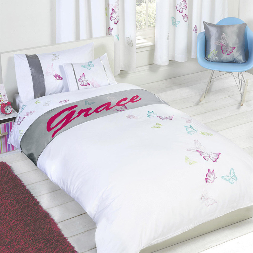 This personalised duvet cover set has been expertly made to be cherished by your loved ones. With it's embroidered butterfly print and custom name, this will add a personal touch to your bedroom. Comes with matching embellished detail pillowcases . This duvet set is made from polycotton making it soft, comfortable and durable.