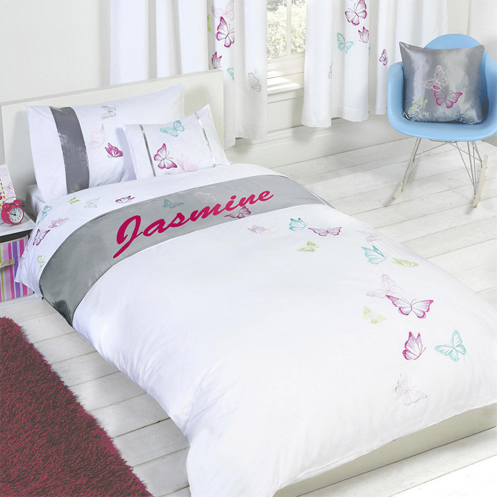 This personalised duvet cover set has been expertly made to be cherished by your loved ones. With it's embroidered butterfly print and custom name, this will add a personal touch to your bedroom. Comes with matching embellished detail pillowcases . This duvet set is made from polycotton making it soft, comfortable and durable.