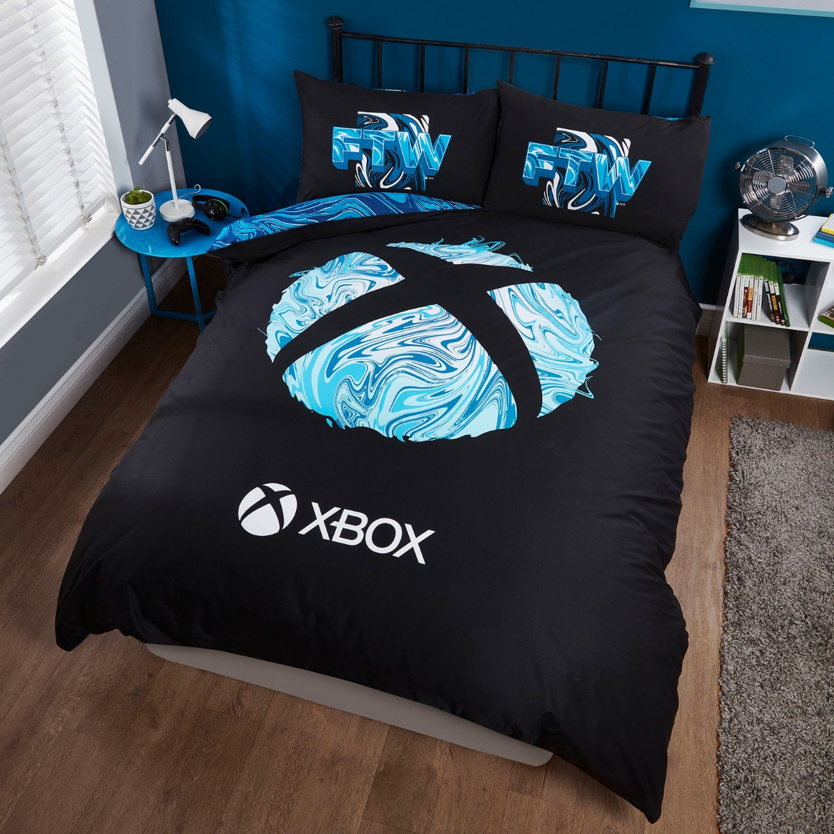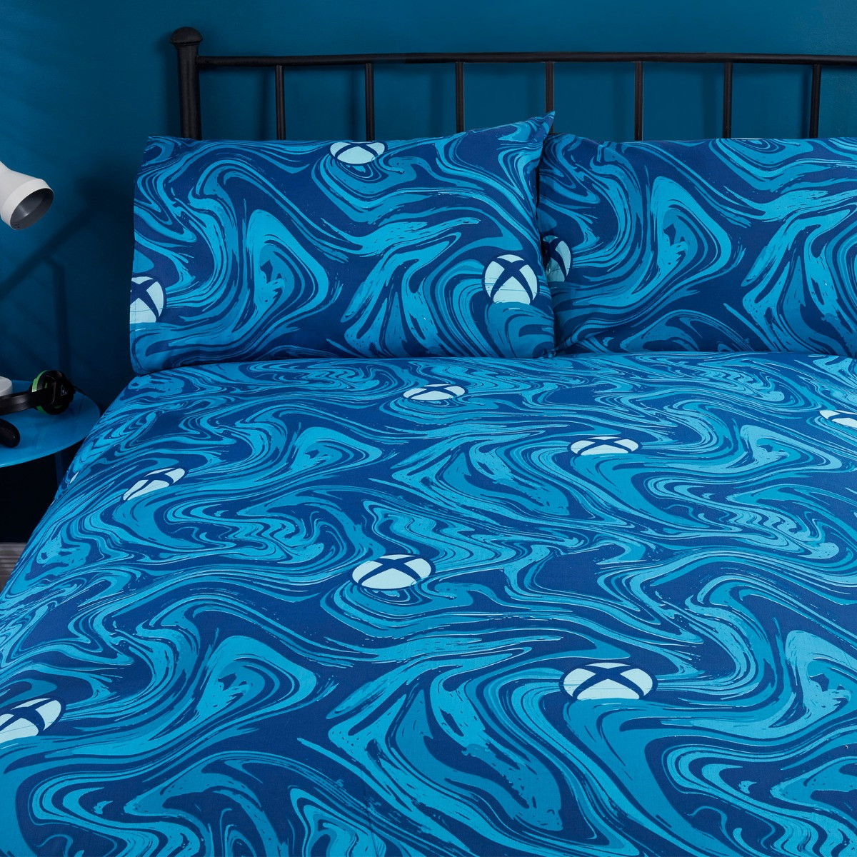 Elevate your gaming space with the Xbox Marble Print Reversible Duvet Set in striking blue. Designed for true gamers, this duvet cover set features a modern marble print infused with iconic Xbox graphics, creating a stylish and dynamic atmosphere. The reversible feature allows you to easily switch up your look, with a complementary pattern on the other side that enhances the overall aesthetic. Crafted from 100% polyester, this duvet set is soft to the touch and built to last, ensuring comfort during your gaming marathons. Its easy-care properties, including wrinkle and fade resistance, keep the set looking fresh and vibrant through every wash. This set includes matching pillowcases, providing a cohesive look for your bedroom.