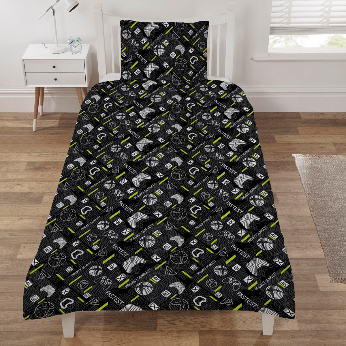 Level up your bedroom with the Xbox Reversible Duvet Set. Embrace the gaming spirit with a sleek black design and two dynamic patterns, perfect for any single-sized gamer's sanctuary.